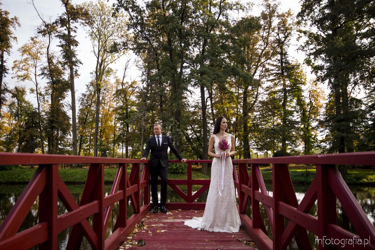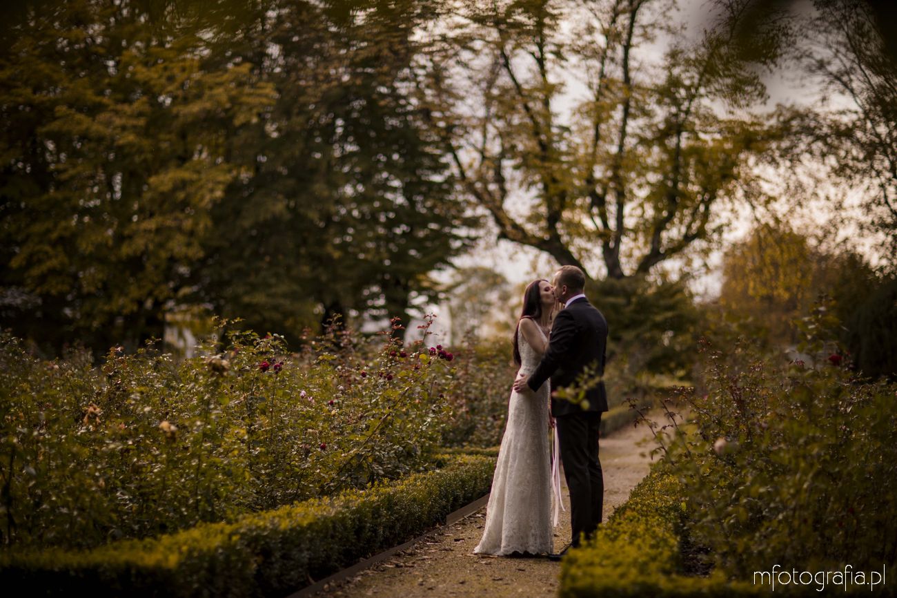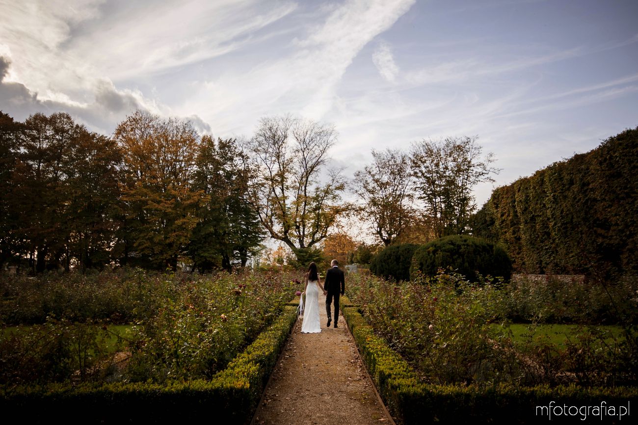 Paulina i Sławek to para, która marzyła o klasycznej i spokojnej sesji poślubnej w tradycyjnej lokalizacji. Takie osoby najlepiej odnajdują się w otoczeniu natury i pięknej architektury. A intymność parków pałacowych jest dodatkowym atutem ważącym o dobrym nastroju Pary Młodej. W Ogrodzie byliśmy niemalże sami i można było się poczuć bardzo swobodnie (w odróżnieniu do parków miejskich, gdzie ciągle pary słyszą gratulacje i czują na sobie wzrok przechodzących obok osób). Ogród był tak duży, że sesję możemy podzielić na kilka różnych planów. Część sesji przed budynkiem Pałacu, część w bajecznym ogrodzie różanym, część w jesiennym parku angielskim i kolejna część nad urokliwym stawem. Sami zobaczcie!