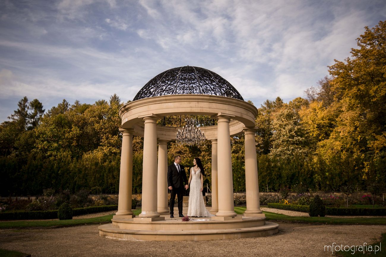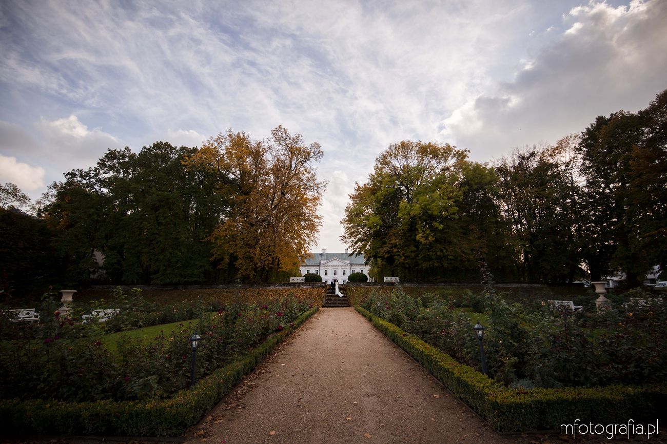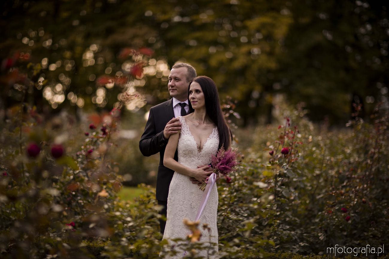 Paulina i Sławek to para, która marzyła o klasycznej i spokojnej sesji poślubnej w tradycyjnej lokalizacji. Takie osoby najlepiej odnajdują się w otoczeniu natury i pięknej architektury. A intymność parków pałacowych jest dodatkowym atutem ważącym o dobrym nastroju Pary Młodej. W Ogrodzie byliśmy niemalże sami i można było się poczuć bardzo swobodnie (w odróżnieniu do parków miejskich, gdzie ciągle pary słyszą gratulacje i czują na sobie wzrok przechodzących obok osób). Ogród był tak duży, że sesję możemy podzielić na kilka różnych planów. Część sesji przed budynkiem Pałacu, część w bajecznym ogrodzie różanym, część w jesiennym parku angielskim i kolejna część nad urokliwym stawem. Sami zobaczcie!
