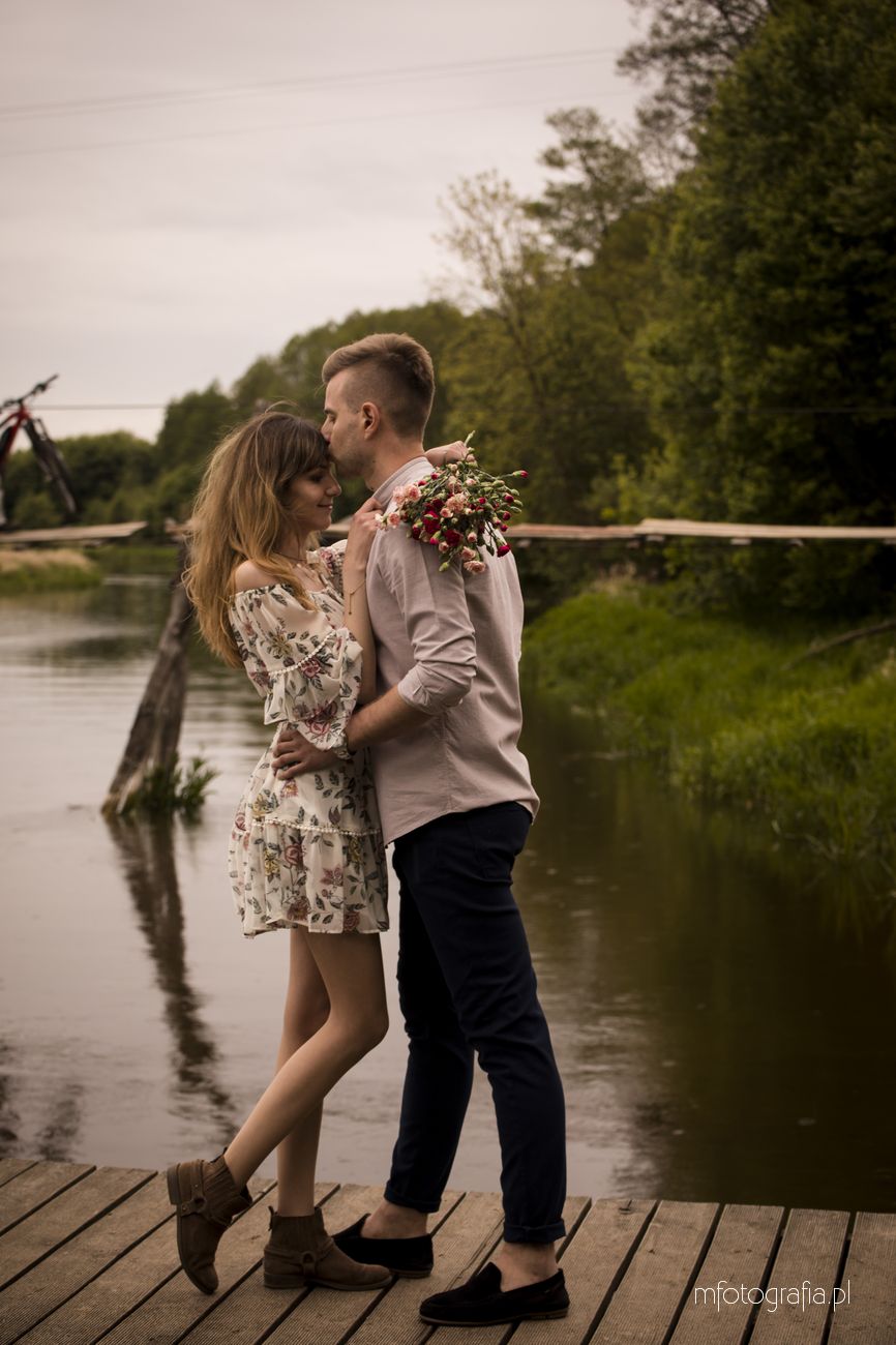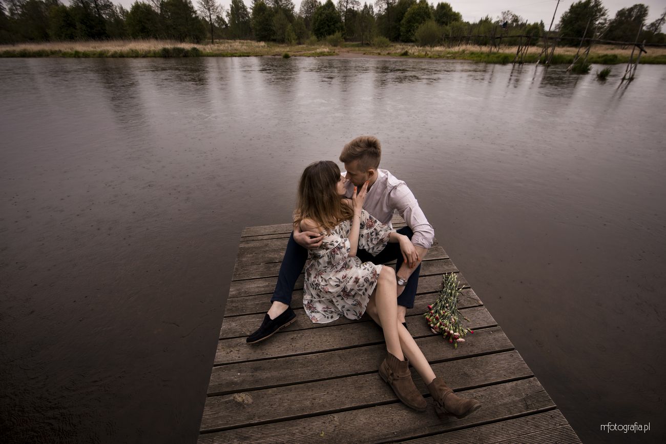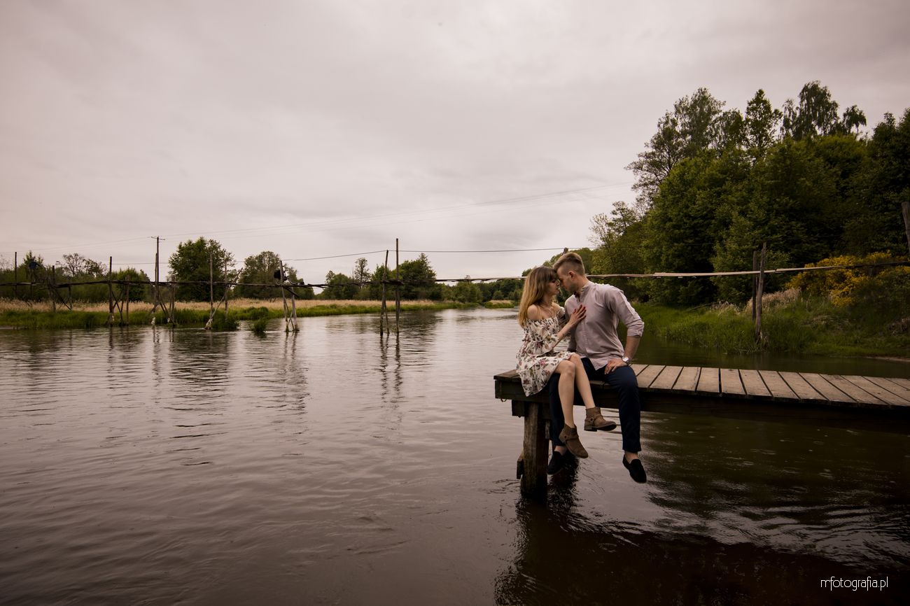 Sesja zaręczynowa w deszczu nad rzeką Pilicą z małpim mostkiem