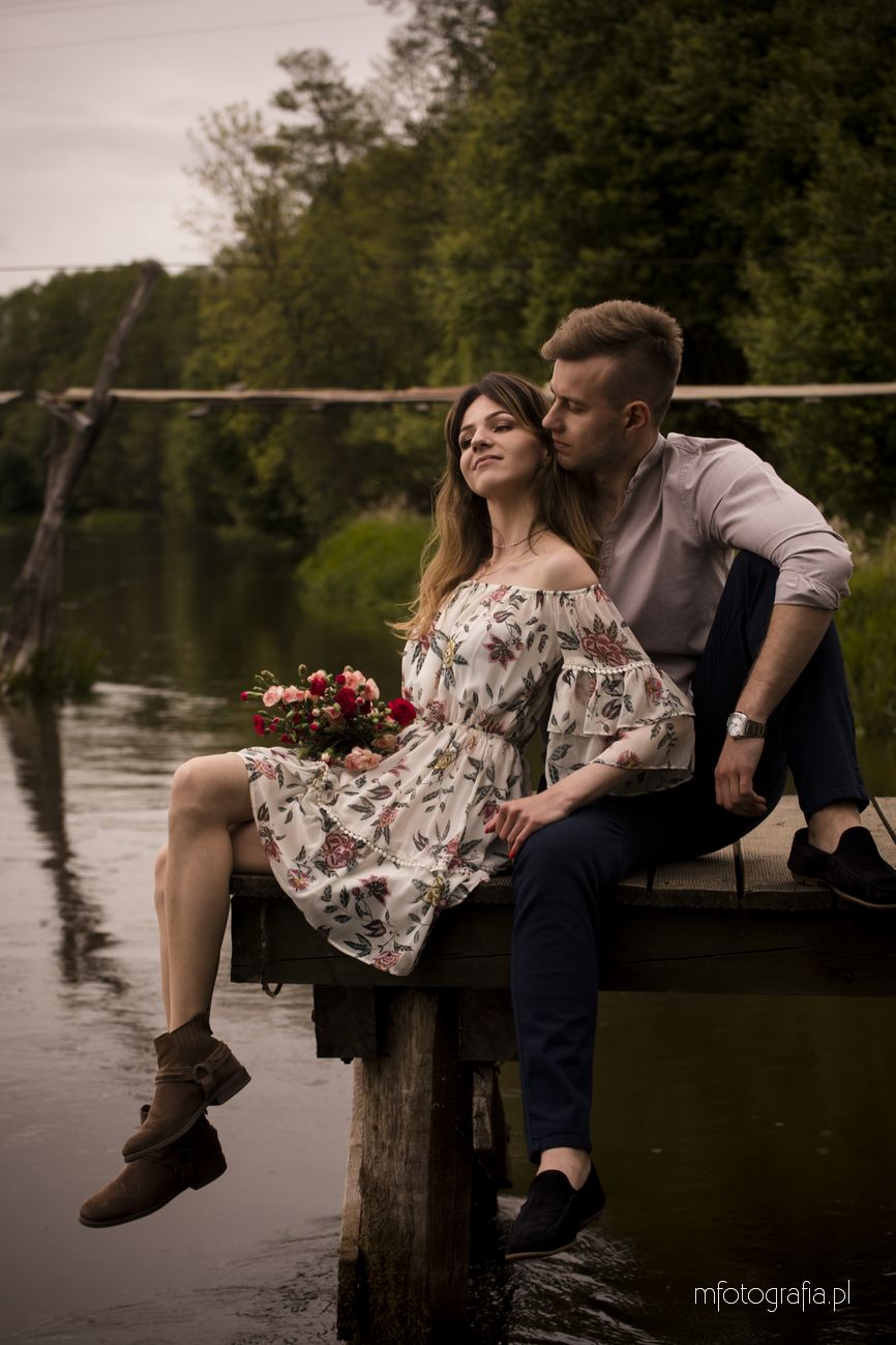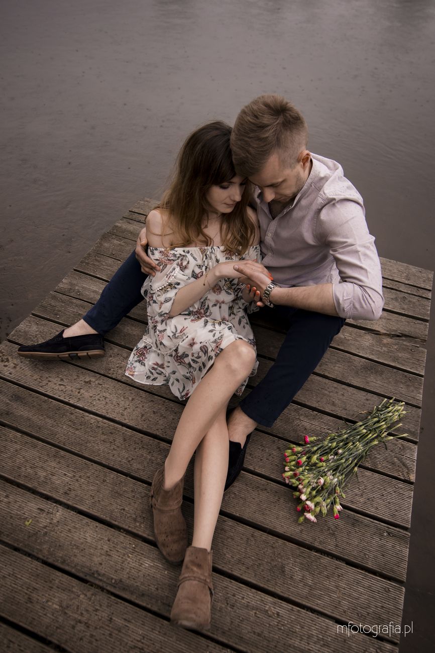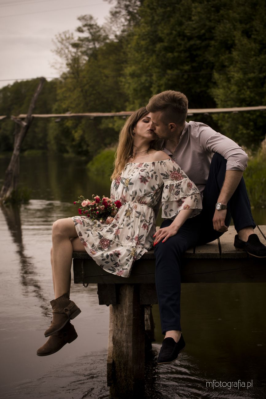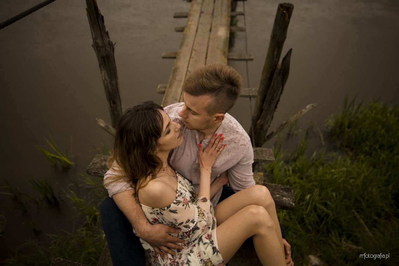 Sesja zaręczynowa w deszczu nad rzeką Pilicą z małpim mostkiem