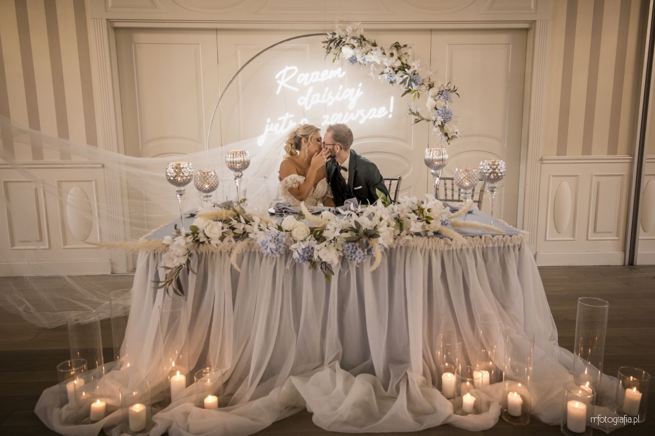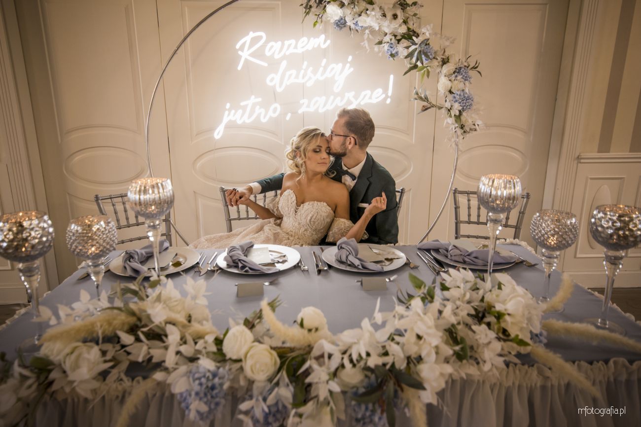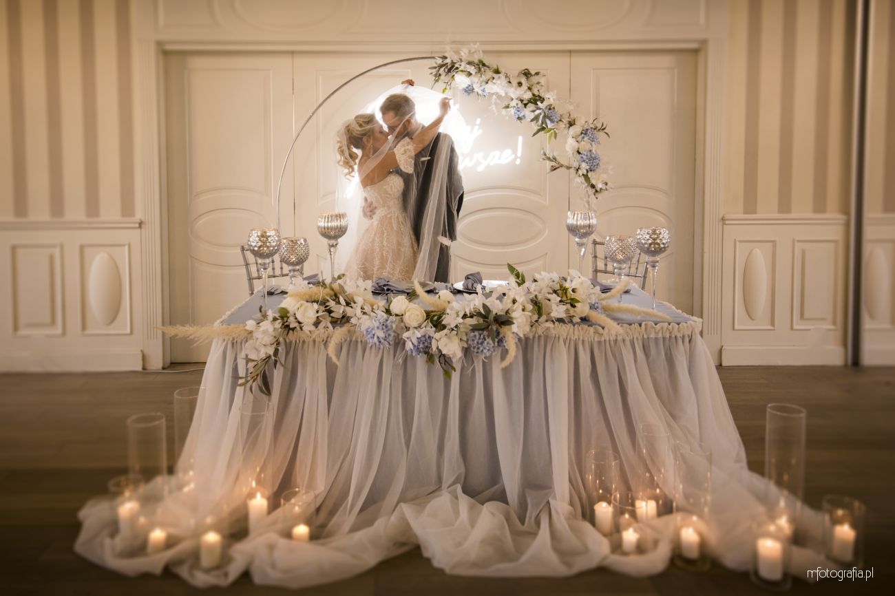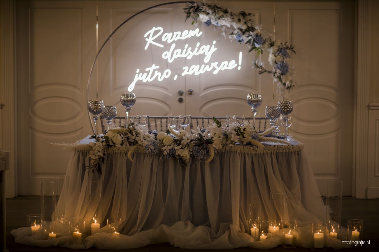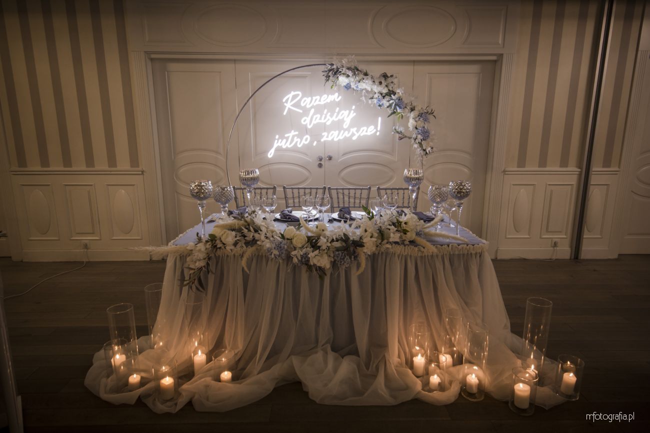 Przechodzimy już do kluczowej części stylizowanej sesji ślubnej w Pałacu Domaniowskim. Ekipa przygotowała wspaniały stół prezydialny, który udekorowany został kolorami zimy. Królował chłodny błękit i srebro. Klimatu dodawał świetlny napis i świeczniki. Wyszło naprawdę cudownie! Sami oceńcie!