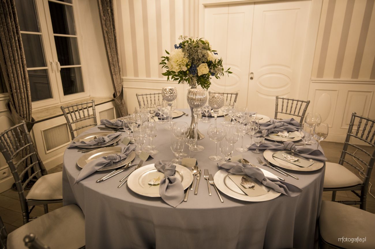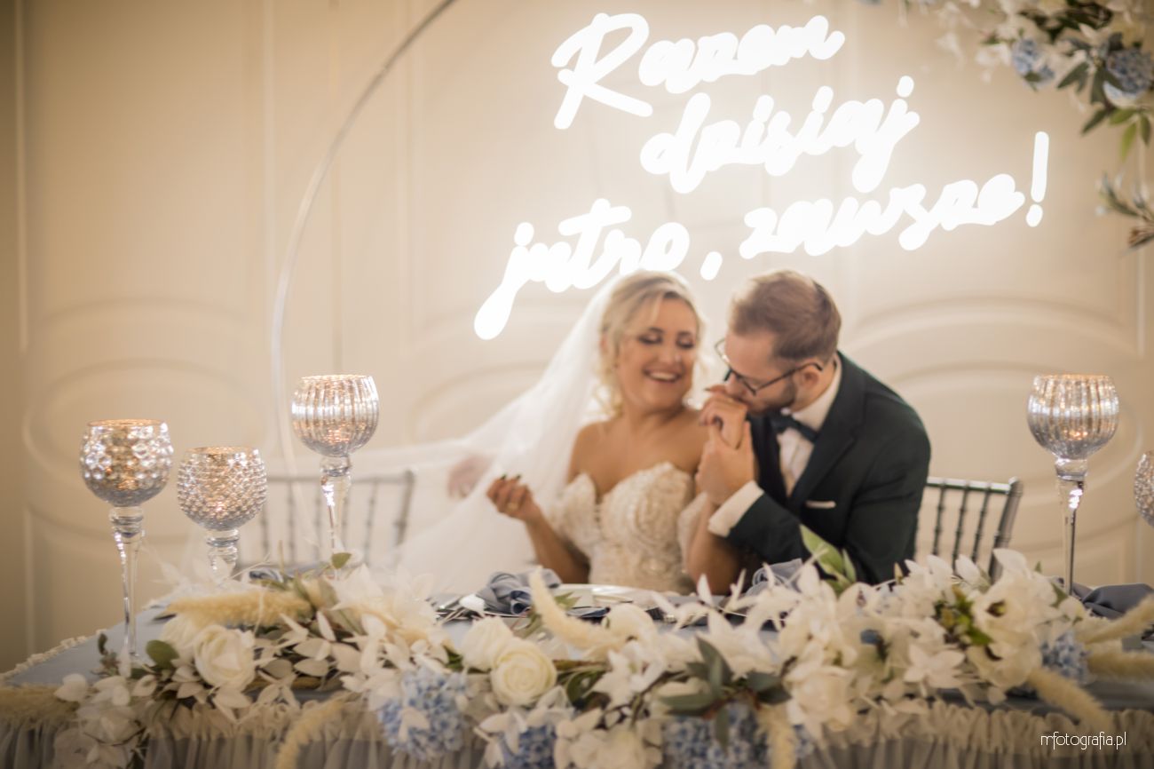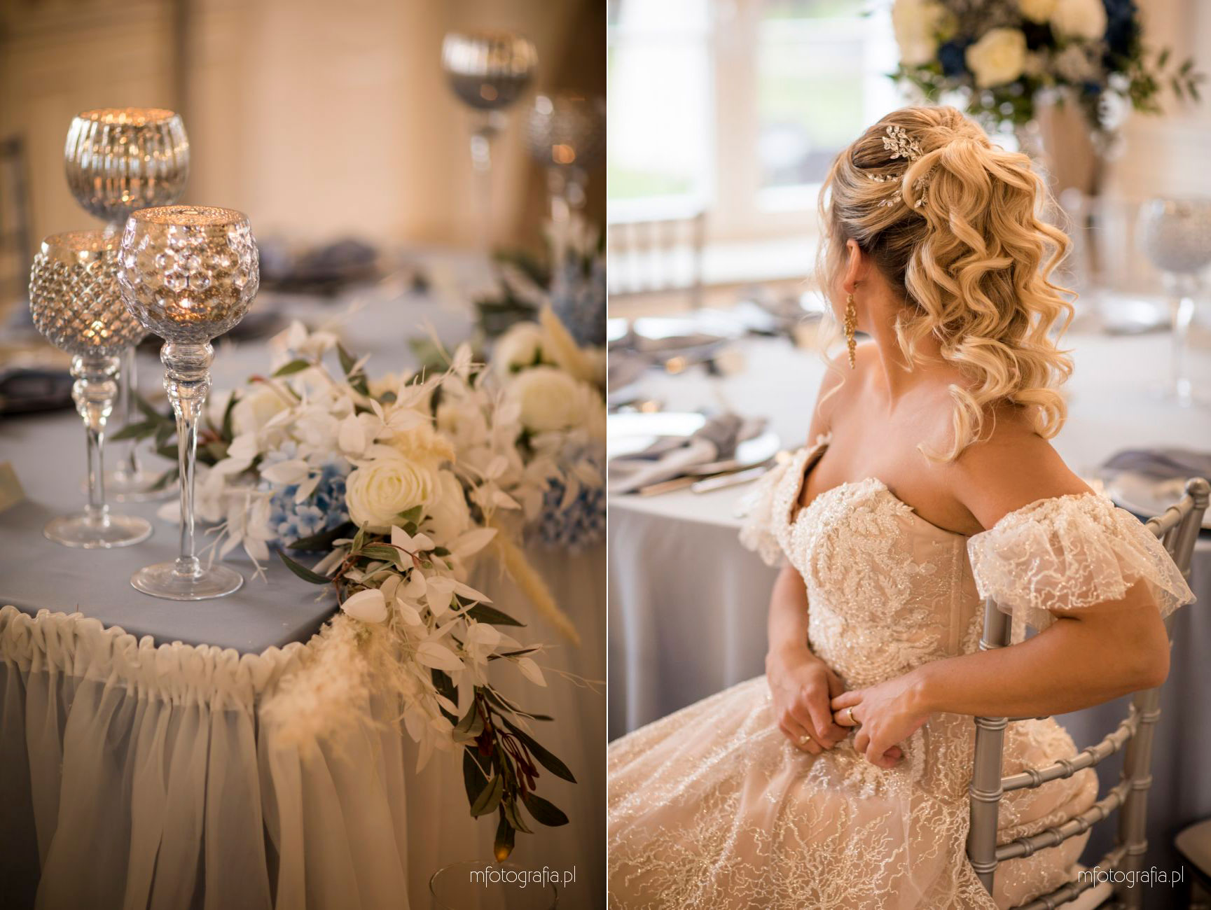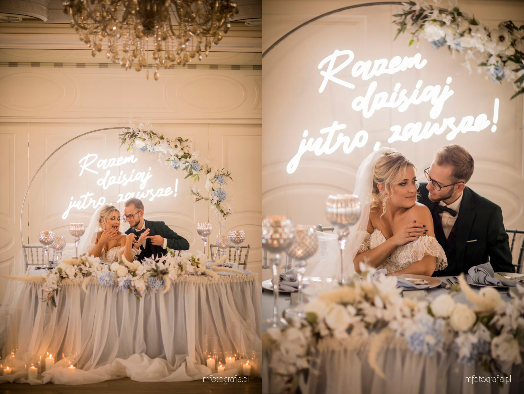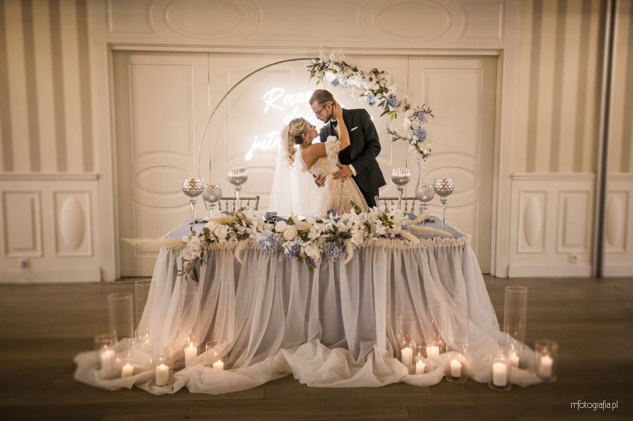 Przechodzimy już do kluczowej części stylizowanej sesji ślubnej w Pałacu Domaniowskim. Ekipa przygotowała wspaniały stół prezydialny, który udekorowany został kolorami zimy. Królował chłodny błękit i srebro. Klimatu dodawał świetlny napis i świeczniki. Wyszło naprawdę cudownie! Sami oceńcie!