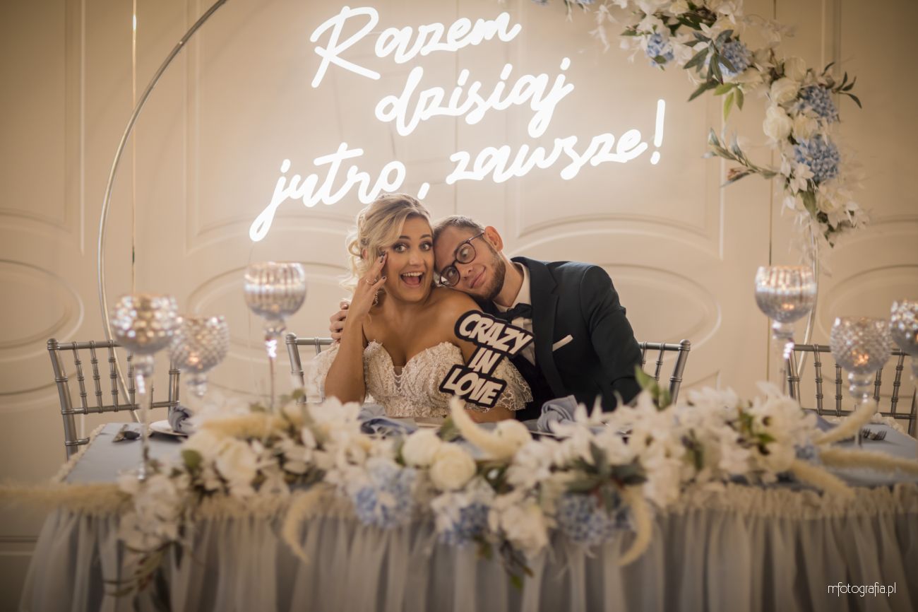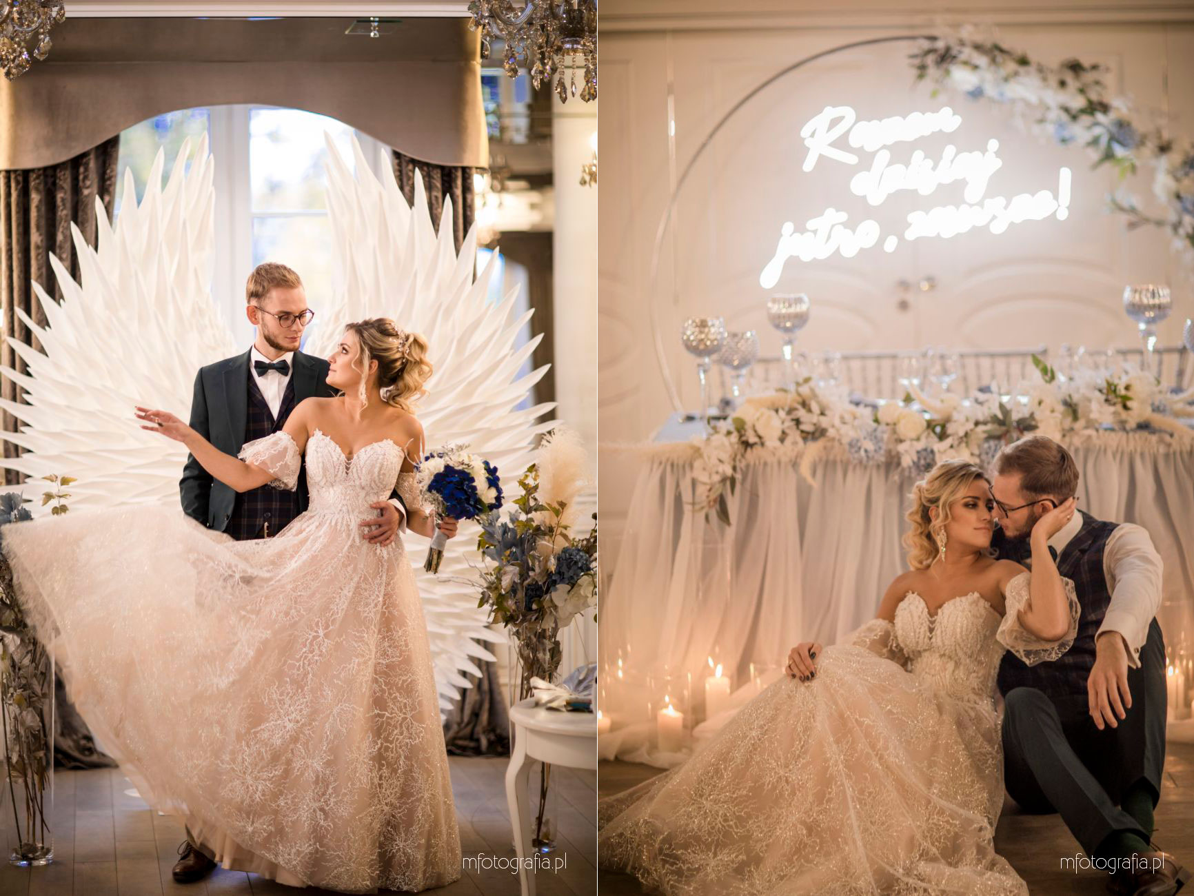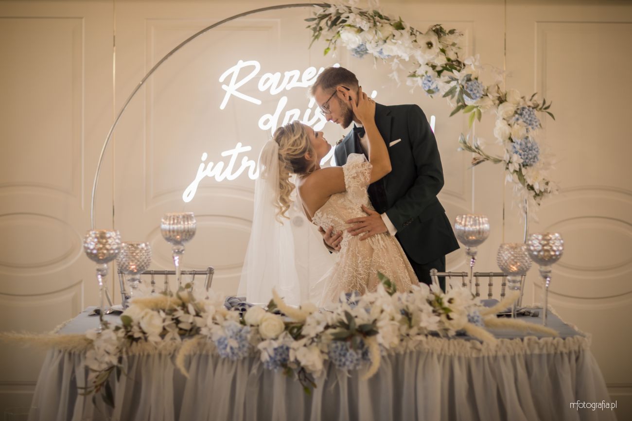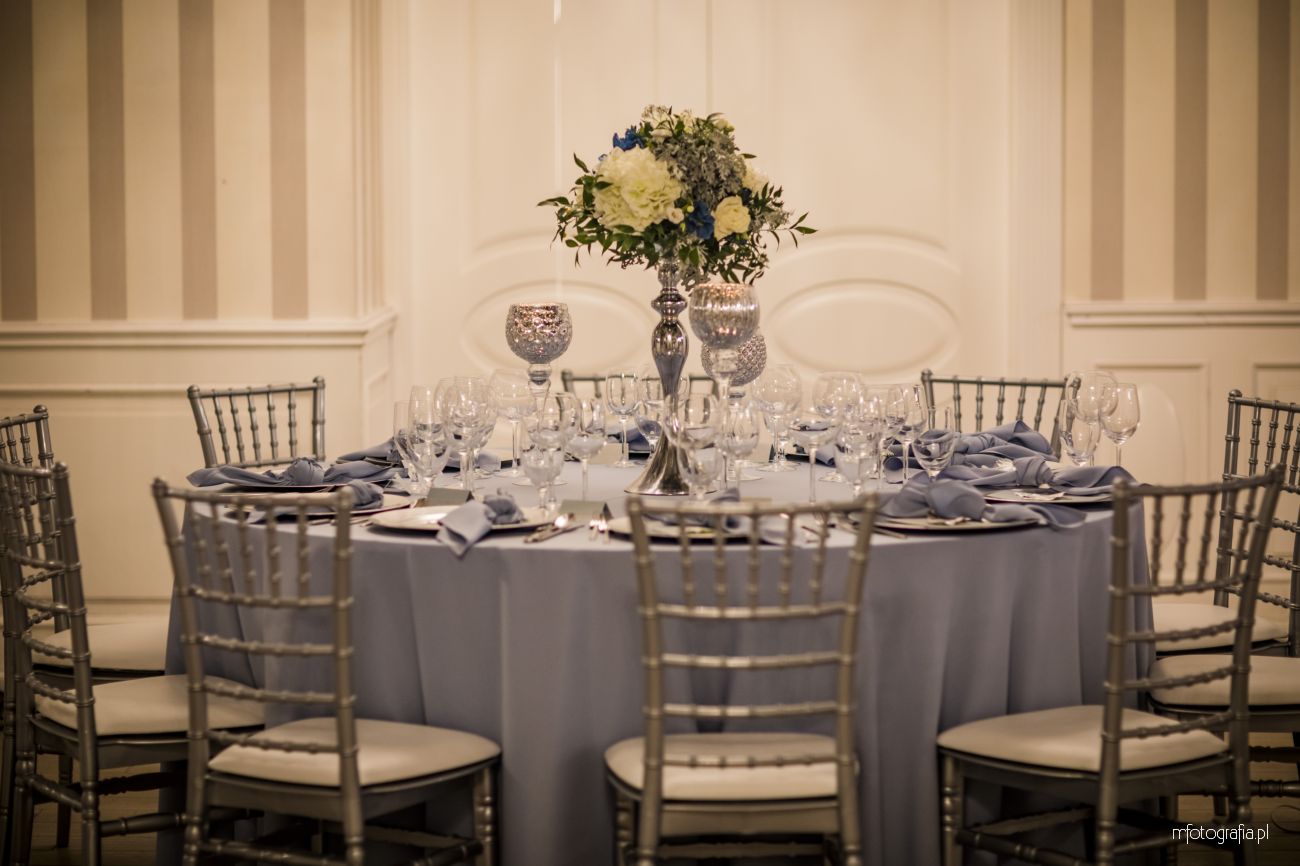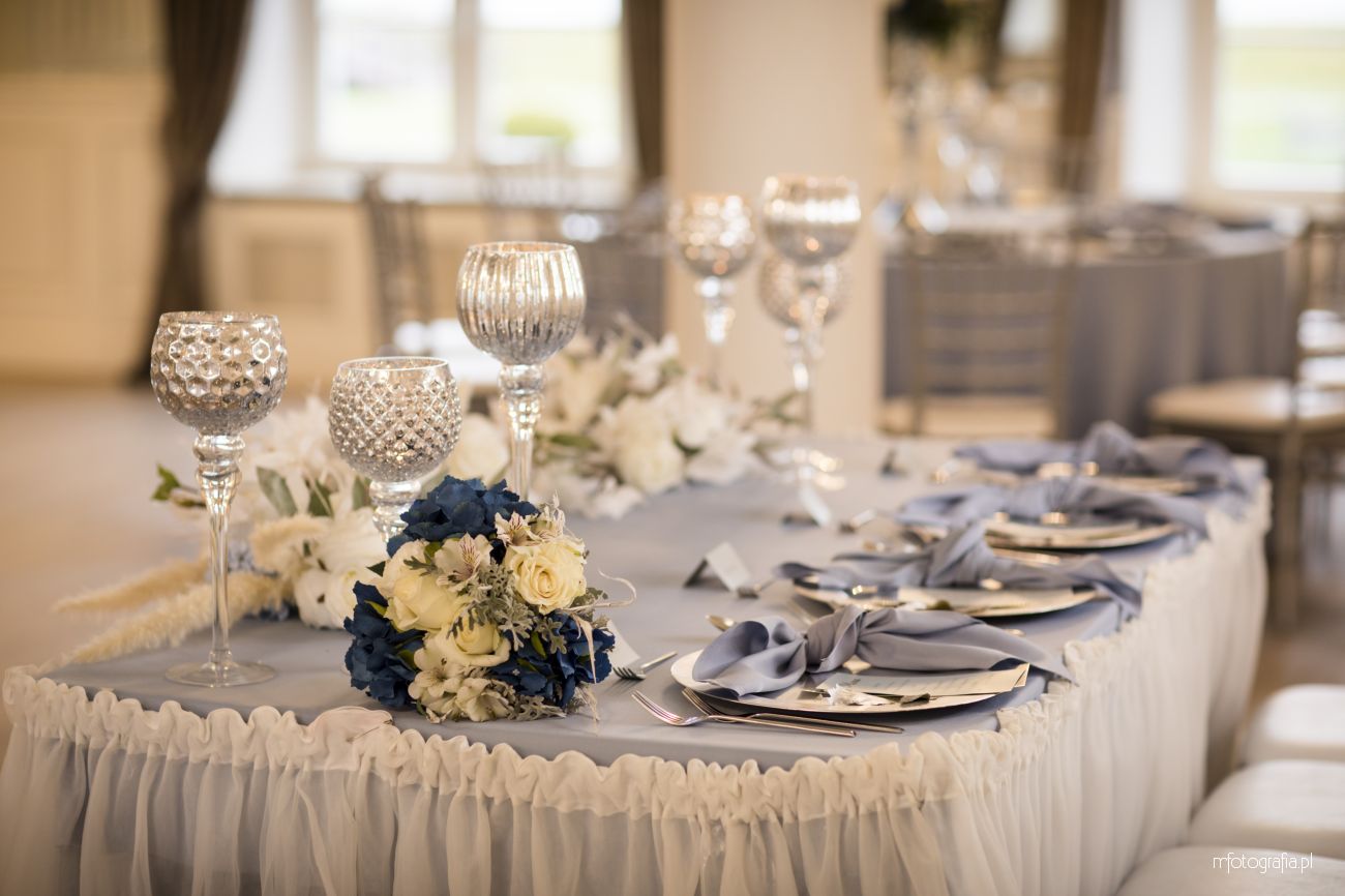 Przechodzimy już do kluczowej części stylizowanej sesji ślubnej w Pałacu Domaniowskim. Ekipa przygotowała wspaniały stół prezydialny, który udekorowany został kolorami zimy. Królował chłodny błękit i srebro. Klimatu dodawał świetlny napis i świeczniki. Wyszło naprawdę cudownie! Sami oceńcie!