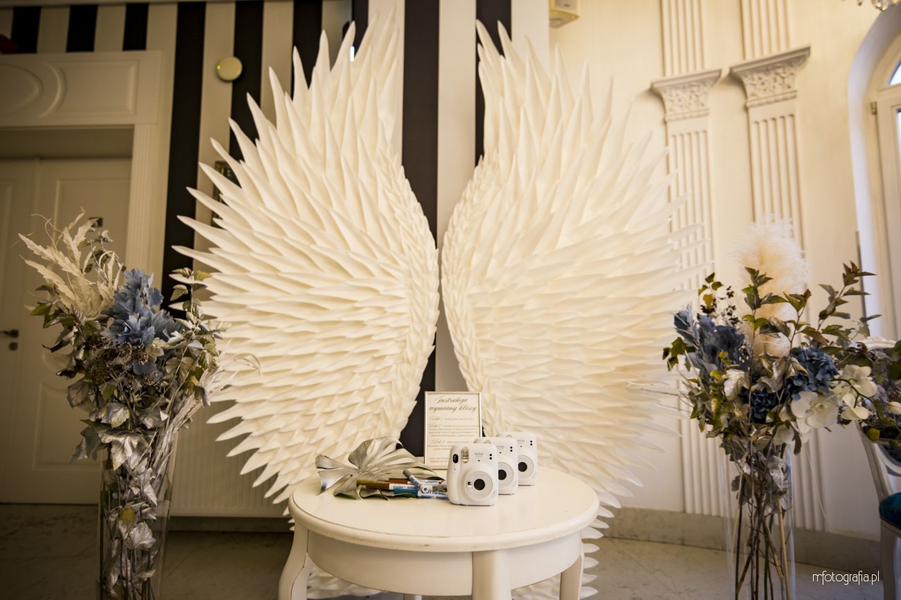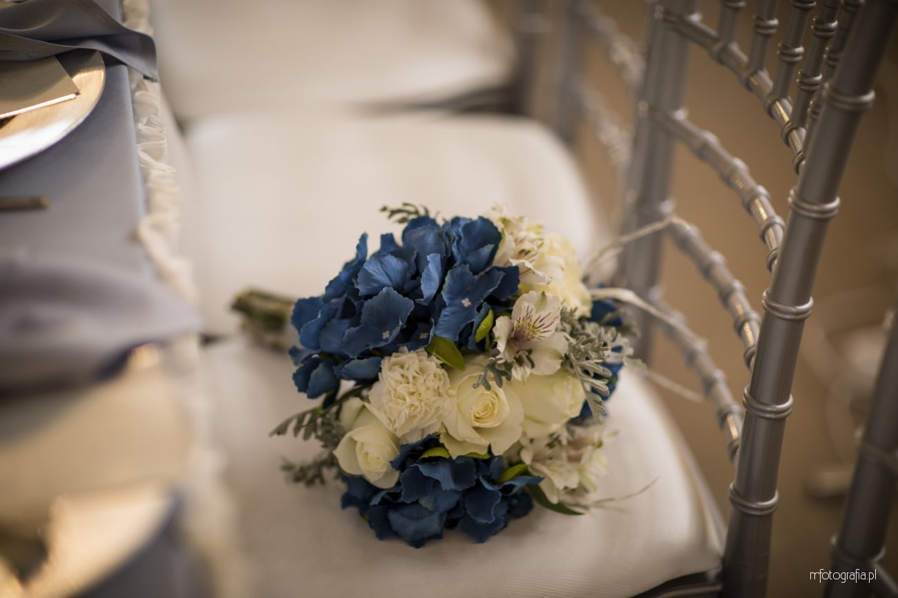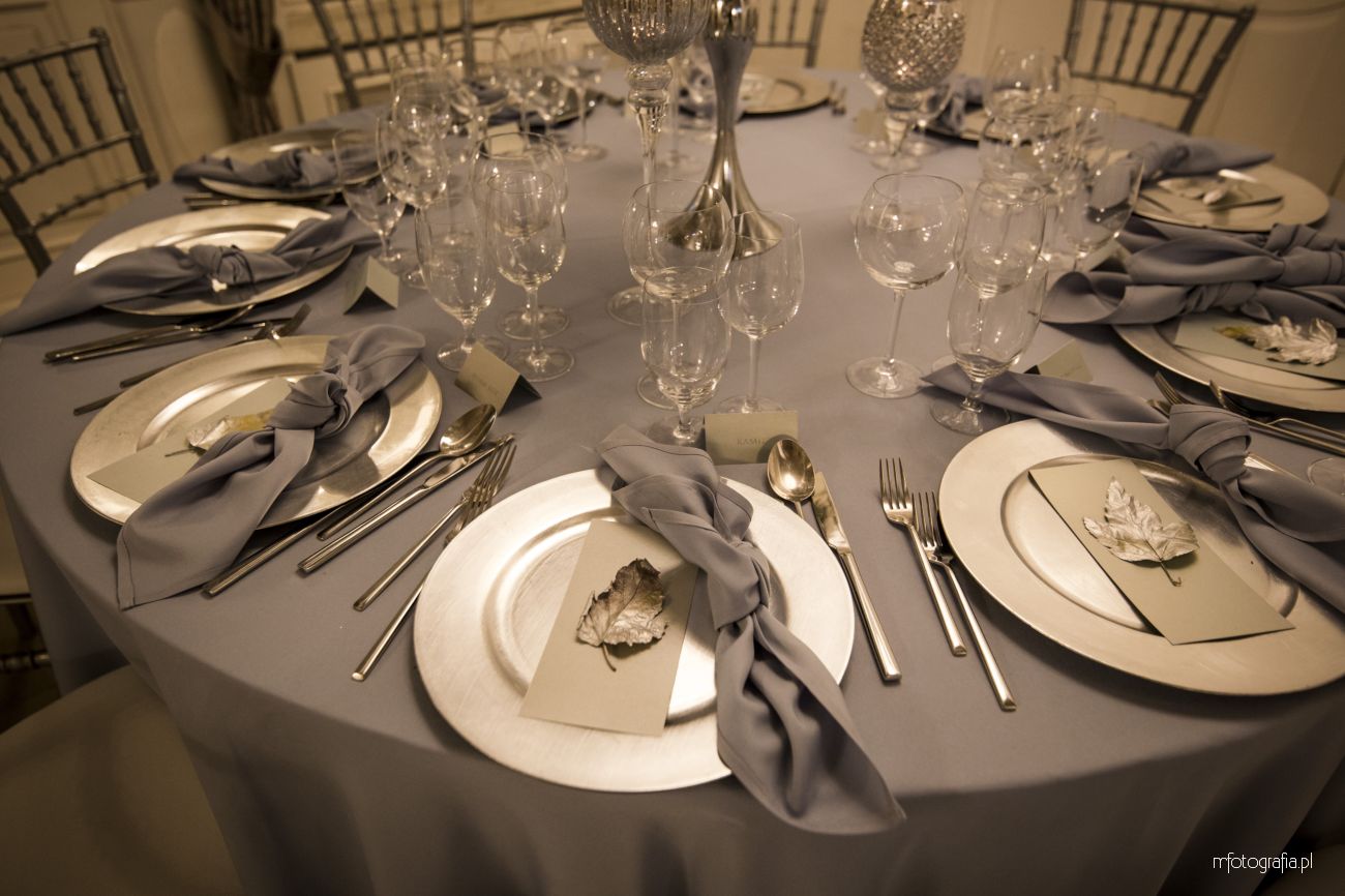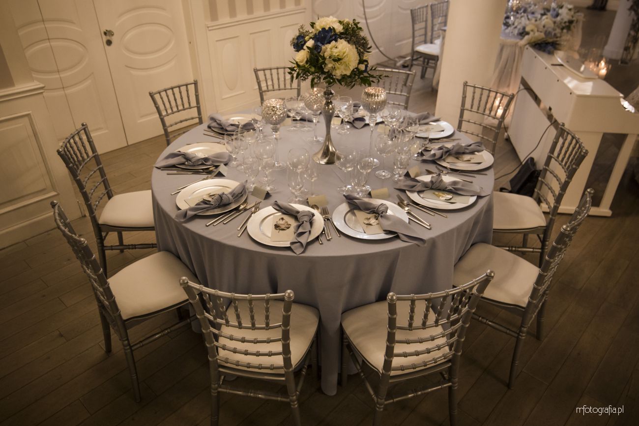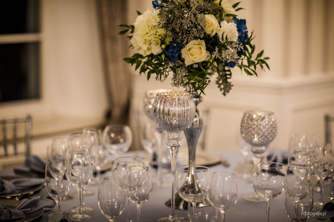 Przechodzimy już do kluczowej części stylizowanej sesji ślubnej w Pałacu Domaniowskim. Ekipa przygotowała wspaniały stół prezydialny, który udekorowany został kolorami zimy. Królował chłodny błękit i srebro. Klimatu dodawał świetlny napis i świeczniki. Wyszło naprawdę cudownie! Sami oceńcie!