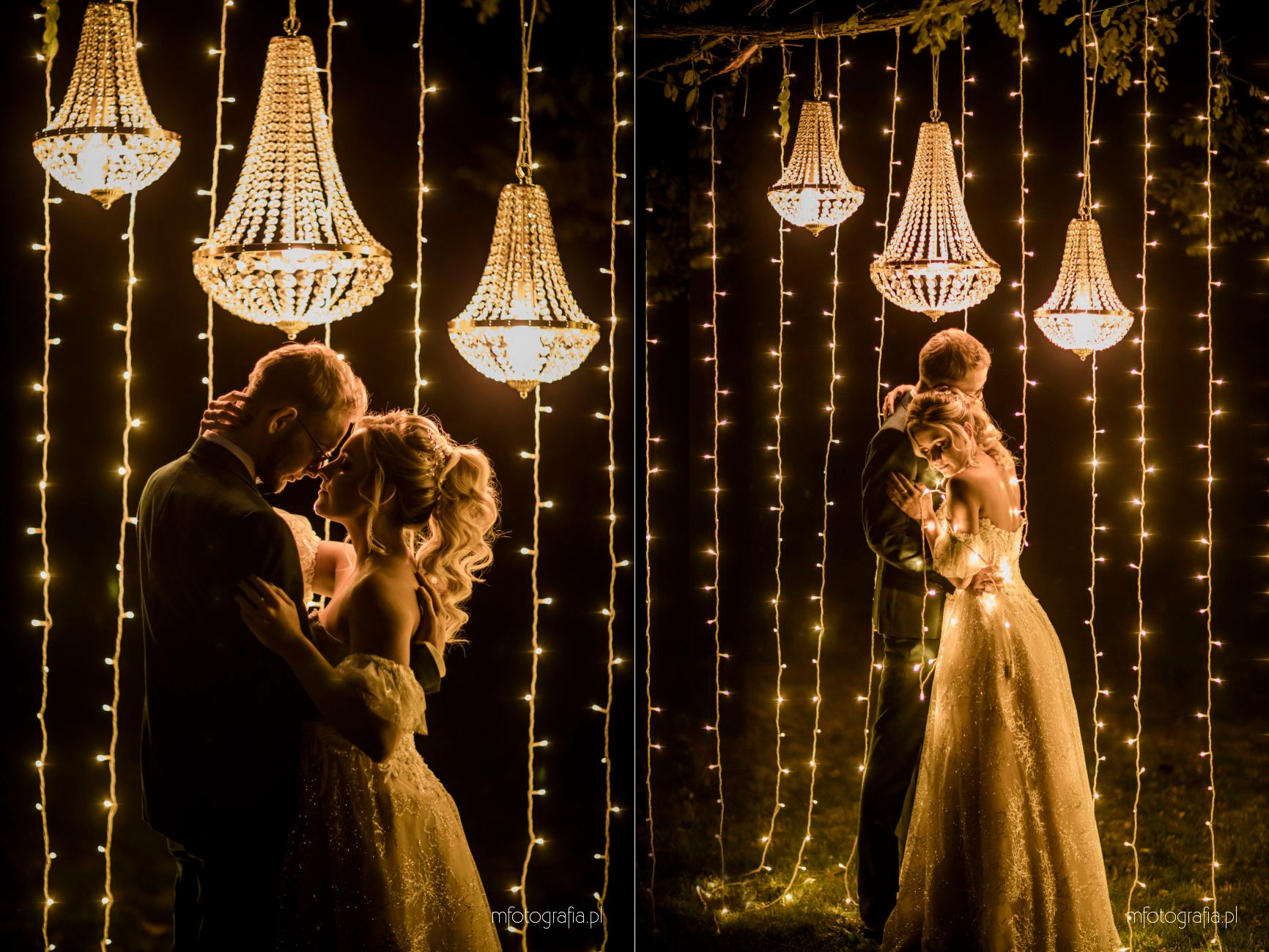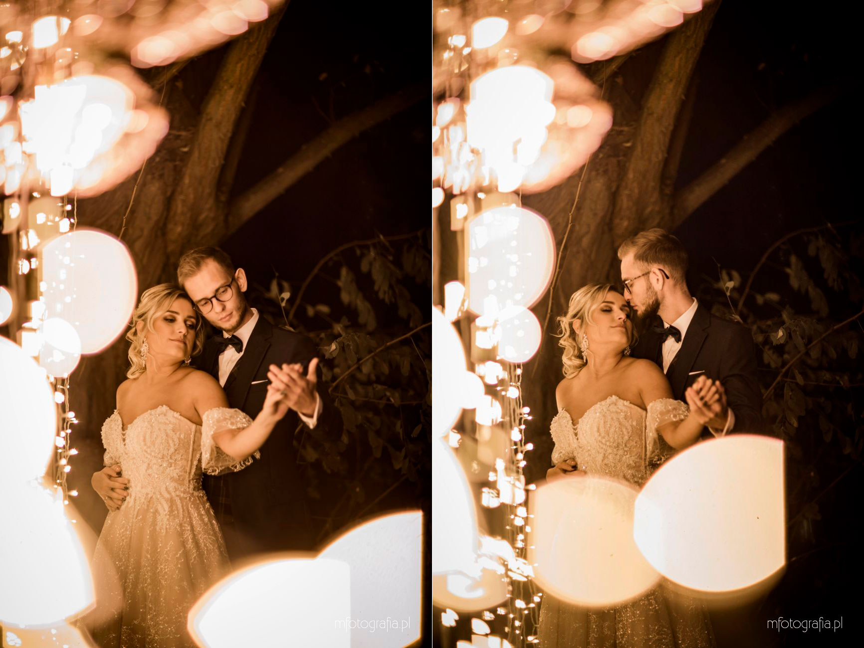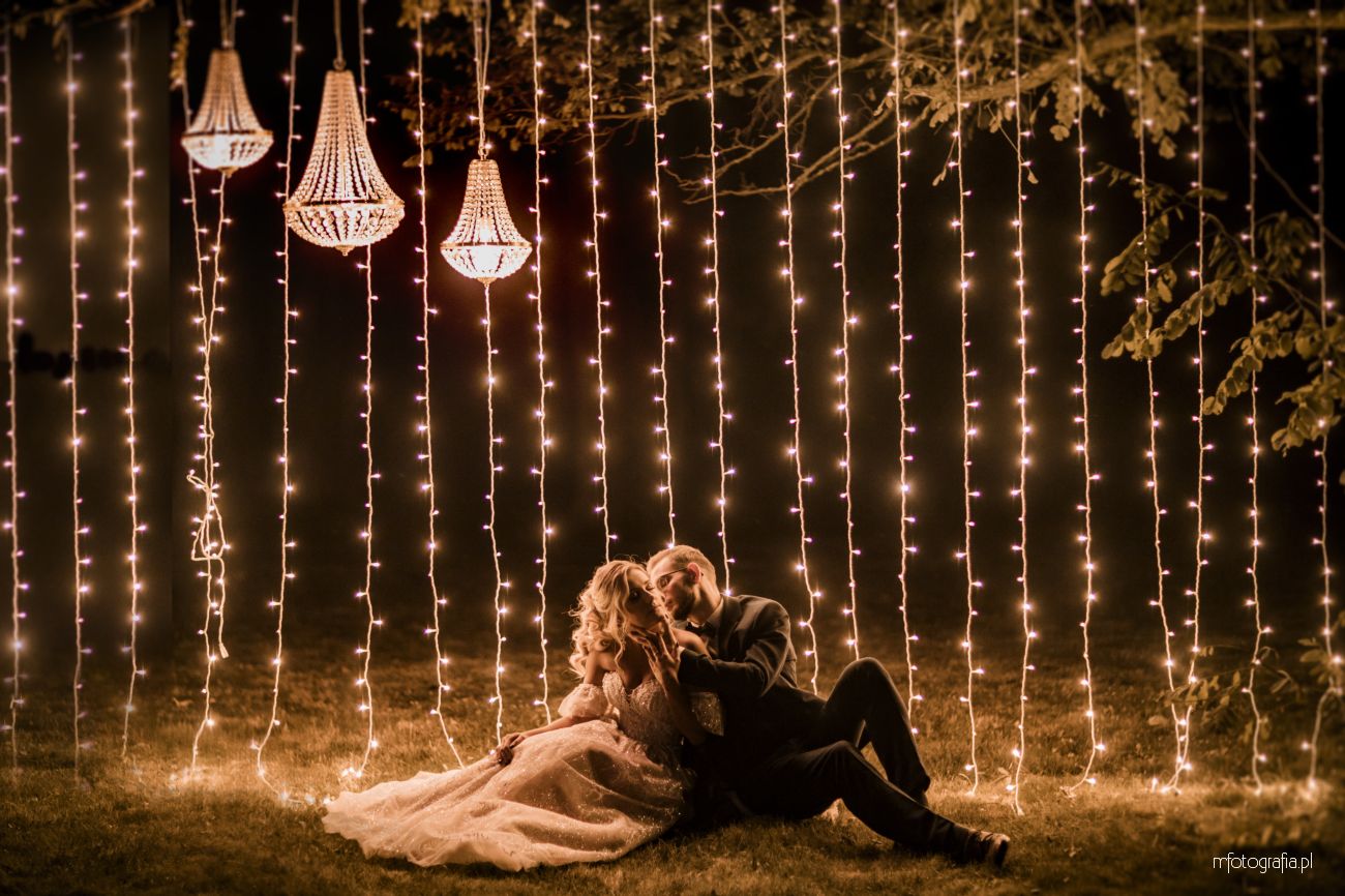 Nocna sesja ślubna w Pałacu Domaniowskim – świetliste dekoracje zwisające z drzew