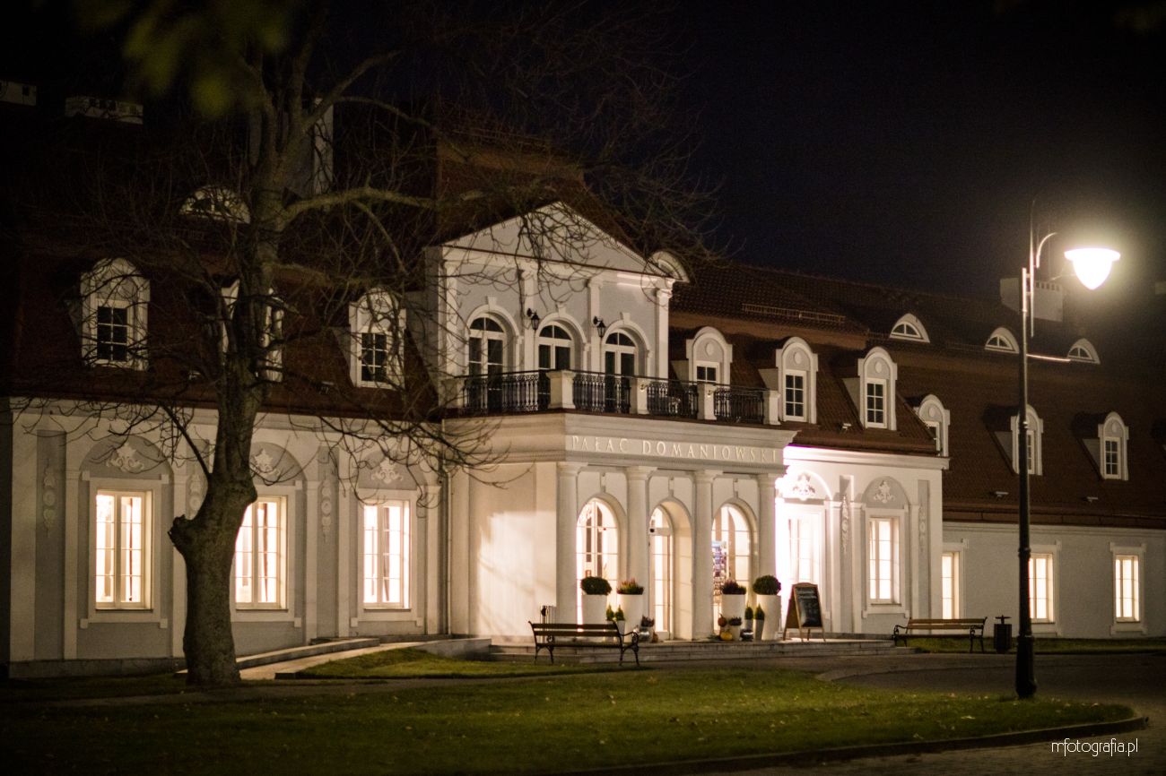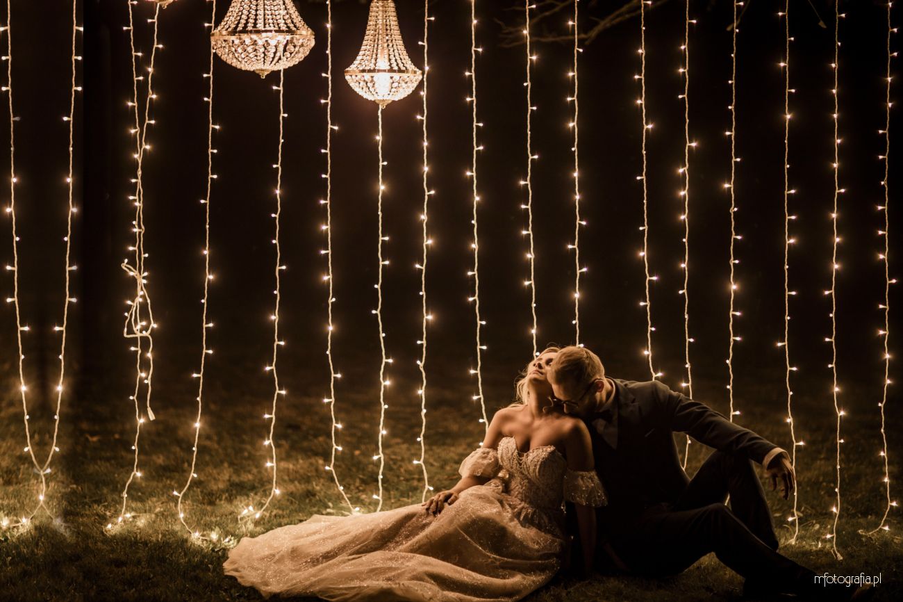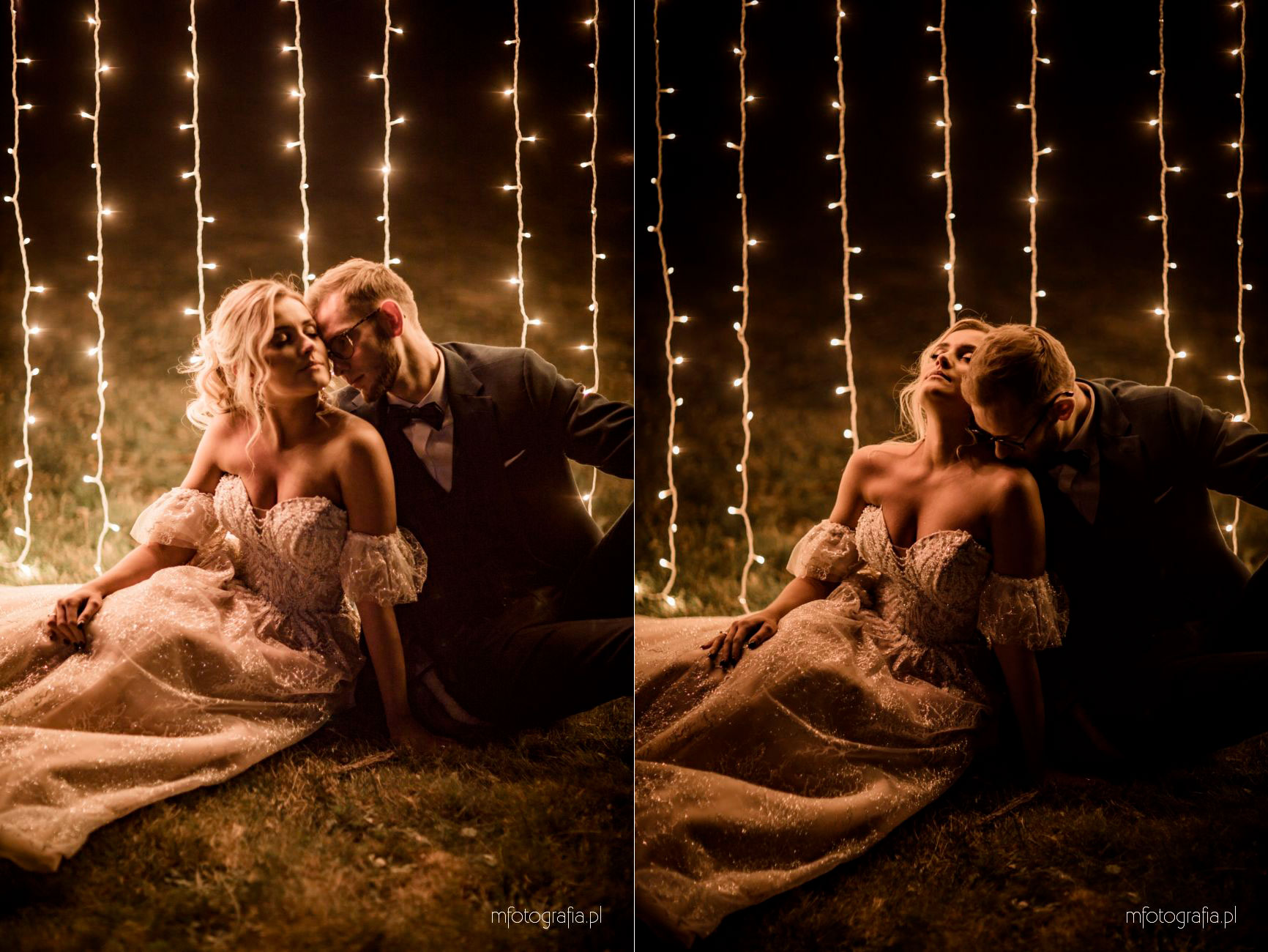 Nocna sesja ślubna w Pałacu Domaniowskim – świetliste dekoracje zwisające z drzew