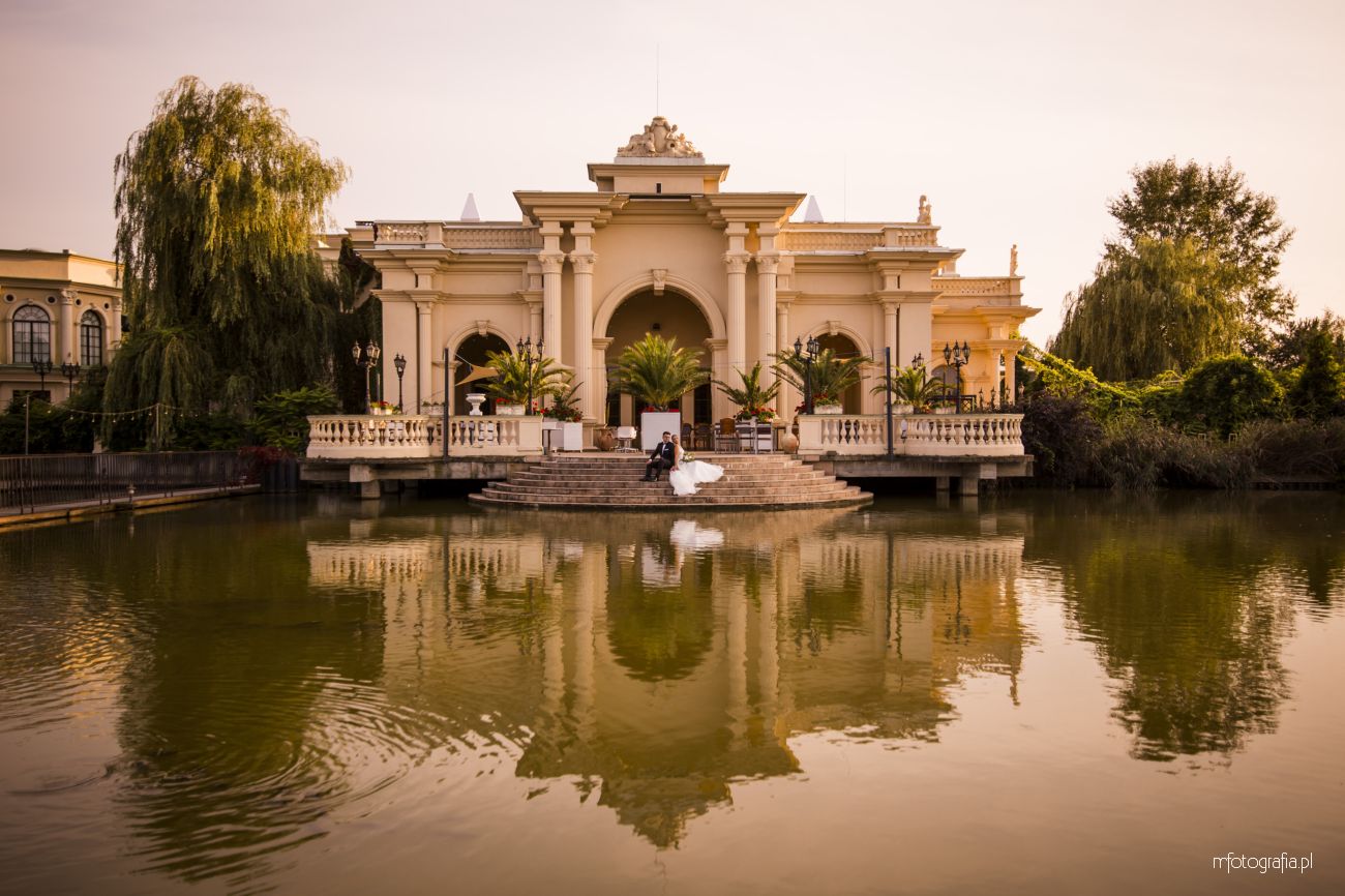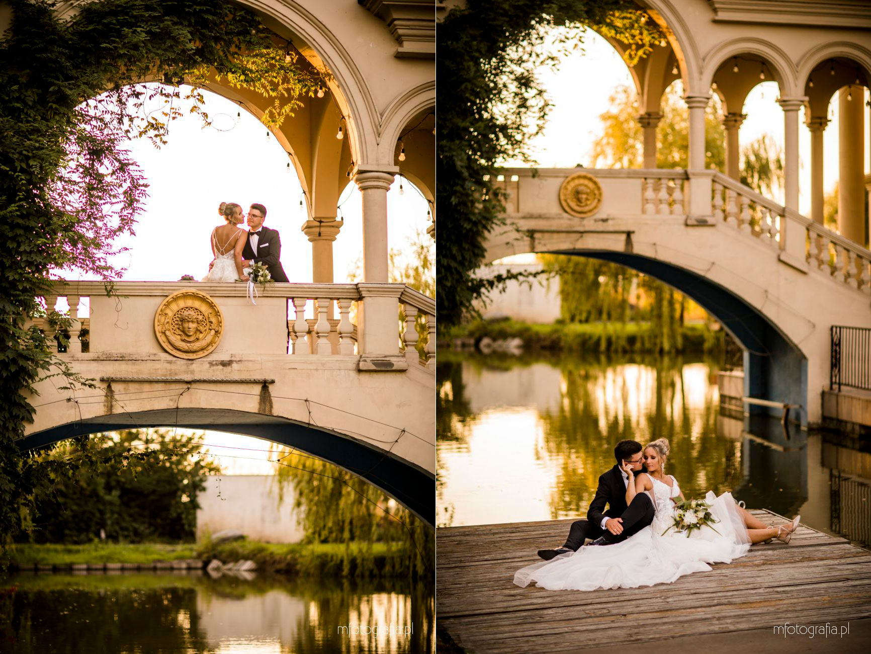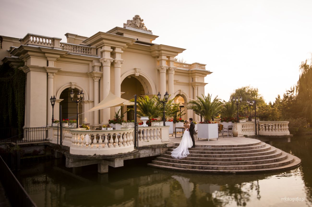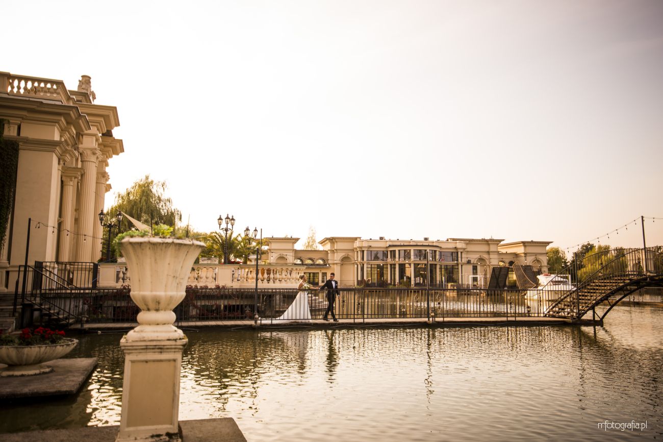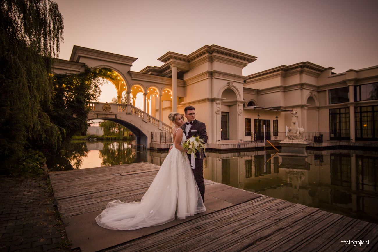 Hotel Venecia Palace to miejsce, które zachwyca ilością zakamarków w różnym stylu. W połączeniu z blaskiem zachodzącego słońca, zdjęcia ślubne wyglądają jakbyśmy odwiedzili Wenecję lub inny malowniczy kraj na południu Europy. Można tam spotkać zarówno ciekawe wnętrza pałacowe jak i klasyczne plenery roślinne. Jest również ogromny staw, który nadaje pałacowi ciekawej formy pływającej budowli. Kinga i Sebastian przygotowali wile atrybutów. Wykorzystaliśmy zimne ognie, szampana oraz cudowny welon Panny Młodej. Sesja prezentuje się wytwornie i na bogato 😉 Oczywiście już ją przedstawiam.
