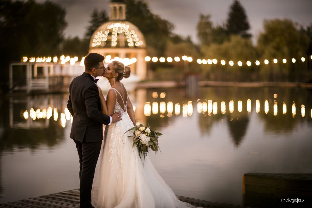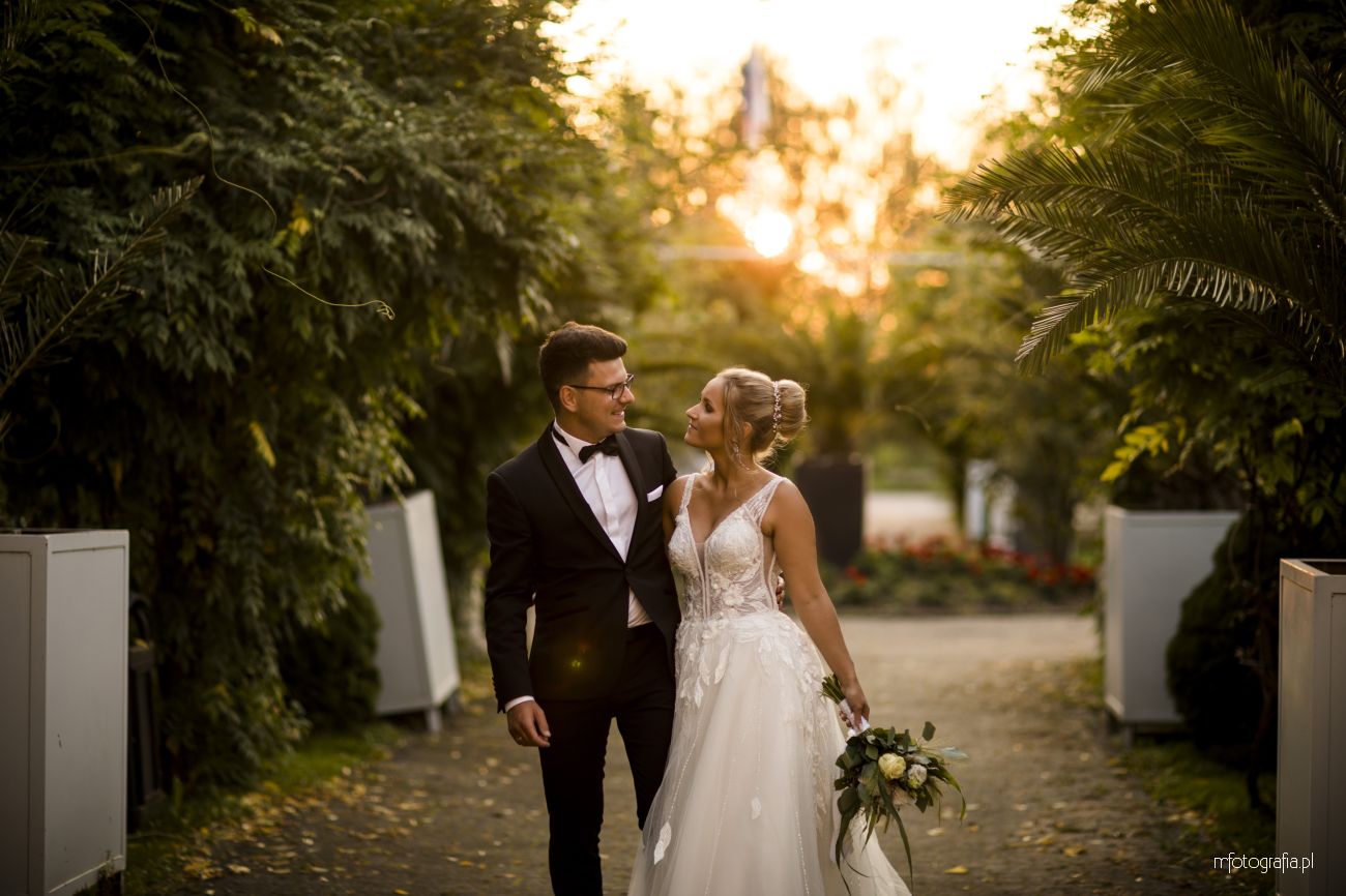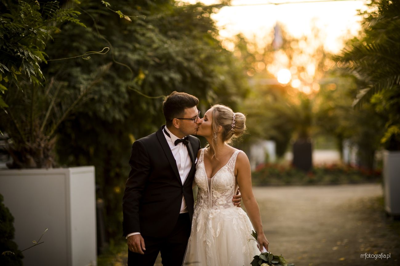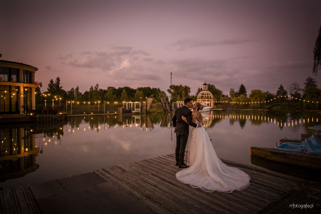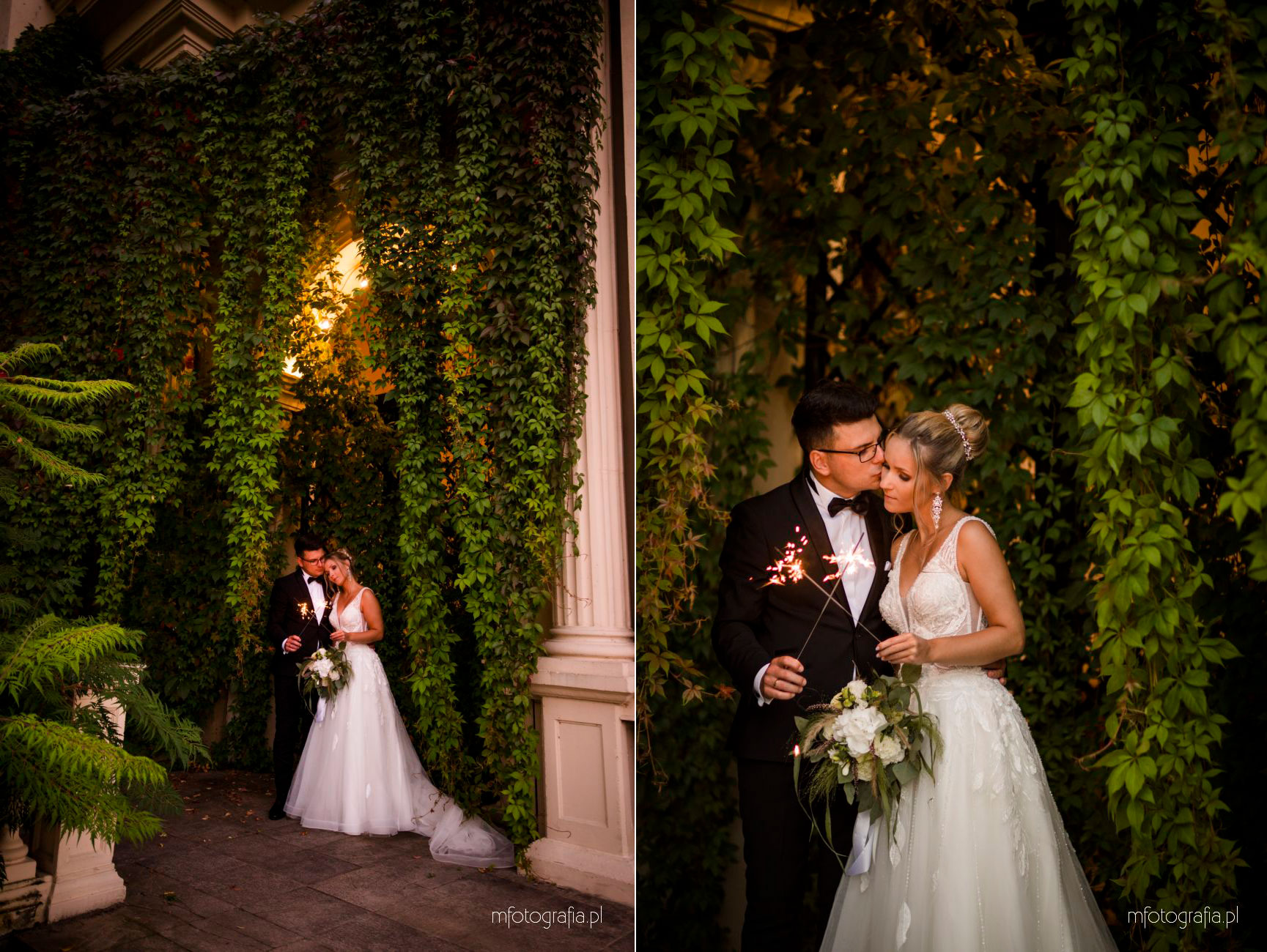 Hotel Venecia Palace to miejsce, które zachwyca ilością zakamarków w różnym stylu. W połączeniu z blaskiem zachodzącego słońca, zdjęcia ślubne wyglądają jakbyśmy odwiedzili Wenecję lub inny malowniczy kraj na południu Europy. Można tam spotkać zarówno ciekawe wnętrza pałacowe jak i klasyczne plenery roślinne. Jest również ogromny staw, który nadaje pałacowi ciekawej formy pływającej budowli. Kinga i Sebastian przygotowali wile atrybutów. Wykorzystaliśmy zimne ognie, szampana oraz cudowny welon Panny Młodej. Sesja prezentuje się wytwornie i na bogato 😉 Oczywiście już ją przedstawiam.