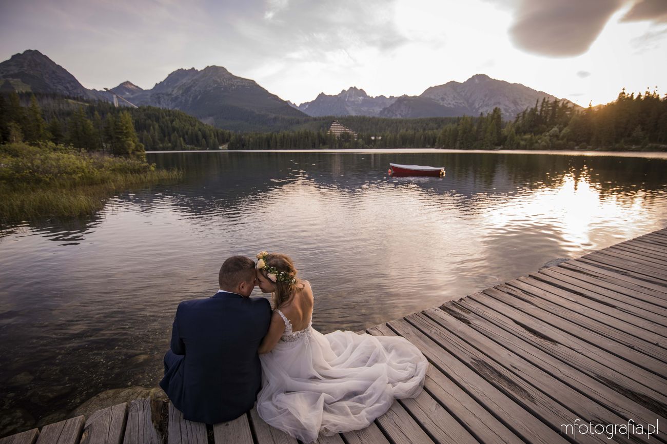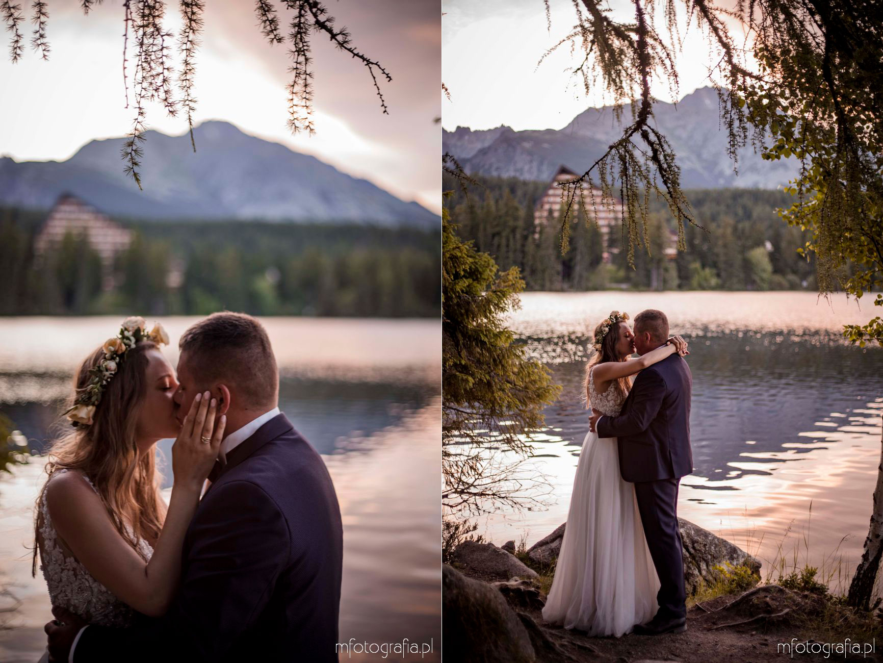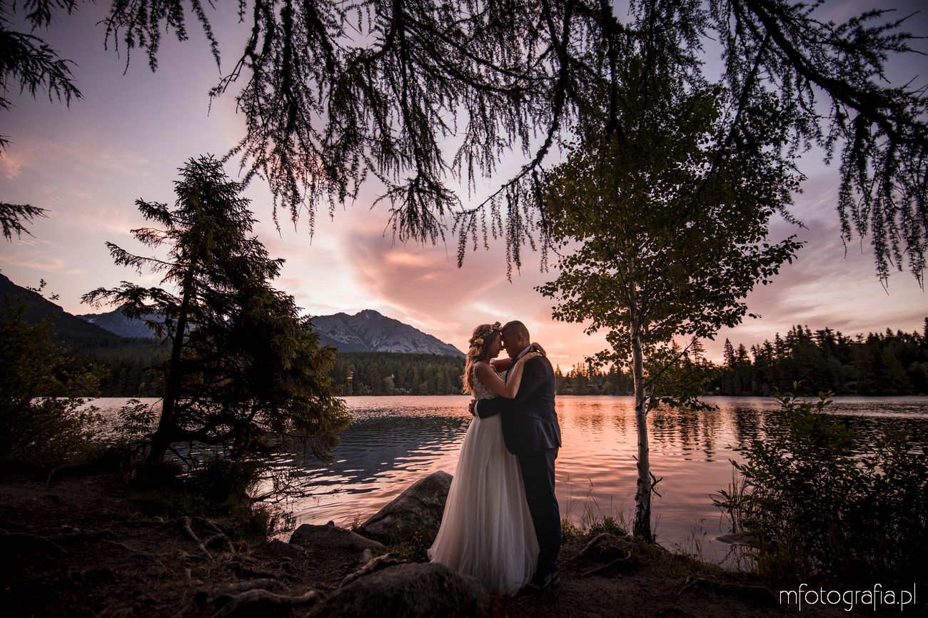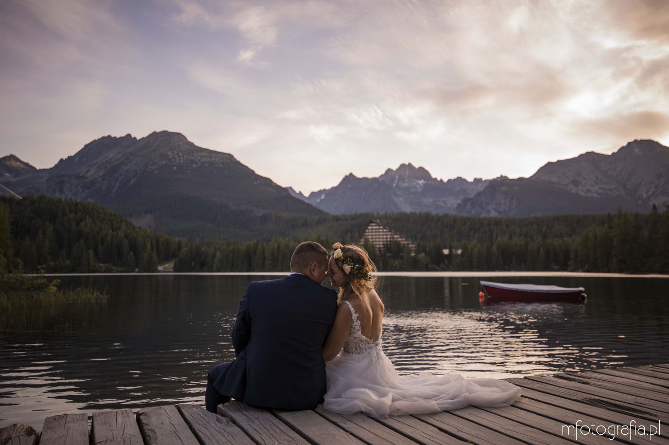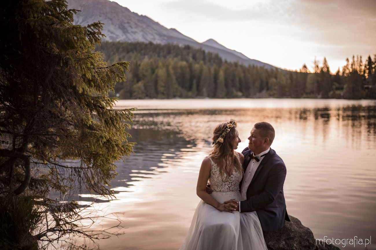 Sesja ślubna nad Szczyrbskim Jeziorem na Słowacji o wschodzie słońca