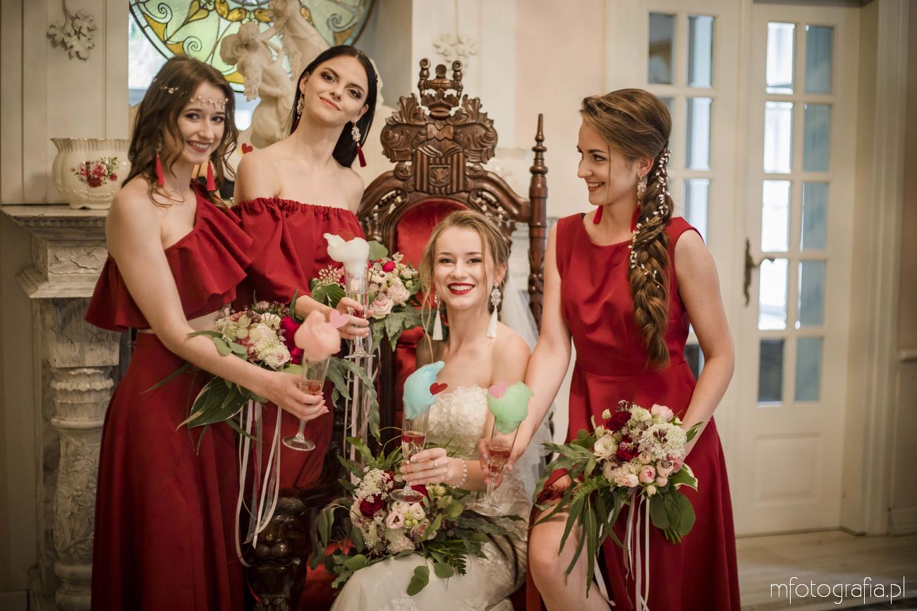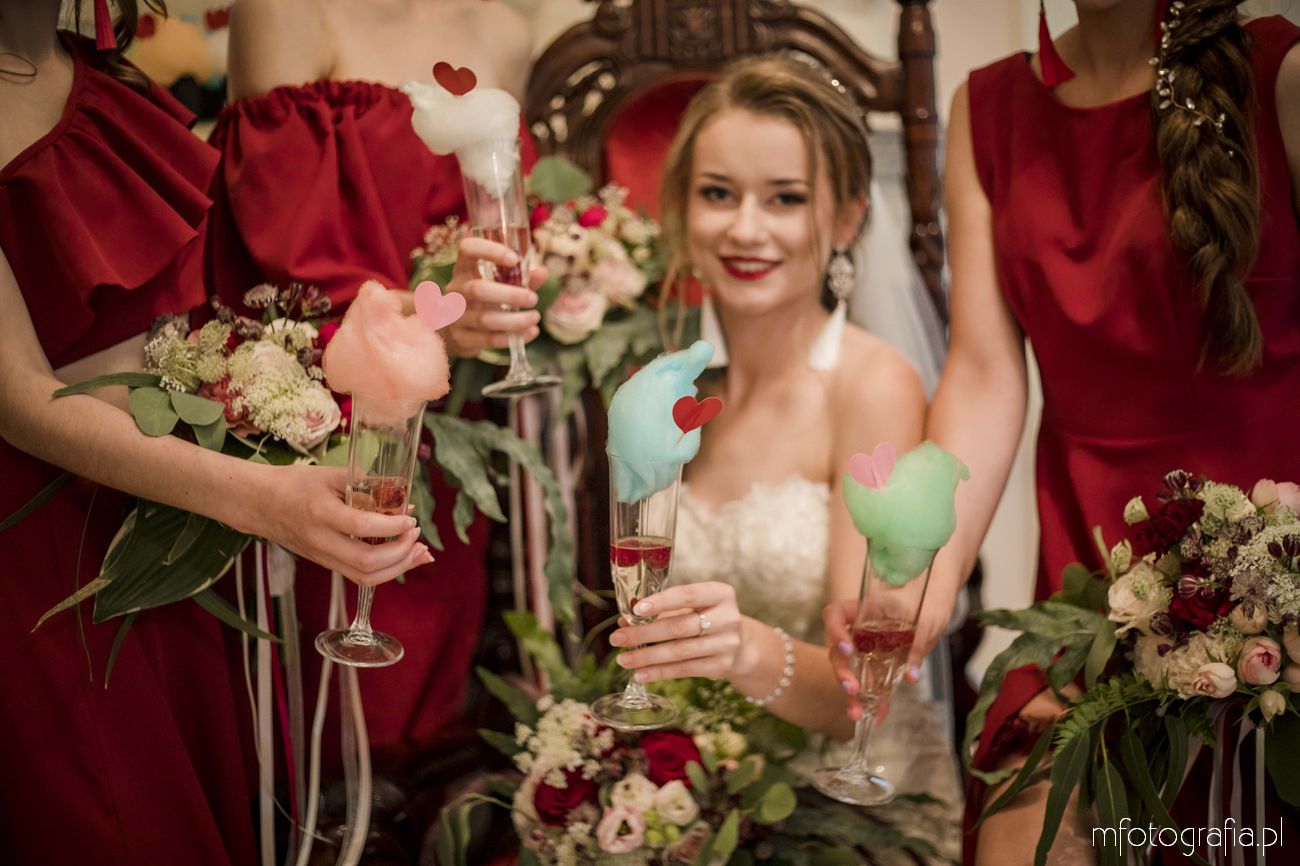 Ola zdecydowała się na wybór kilku dziewczyn, które będą ją wspierać na ślubnym kobiercu. Ubrała je w długie sukienki, które posiadają burgundowy kolor – motyw przewodni na ślubie. Było zimno, więc postawiła również na futrzane etole i pięknie dobrała kryształkową biżuterię i buty każdej z dziewczyn. Stylizacje nie były identyczne, co podkreślało indywidualność i piękno każdej z druhen. Styl pałacowego wnętrza świetnie zgrał się z kolorem przewodnim i dodał bogatego charakteru fotografią. A dla rozluźnienia atmosfery użyliśmy szampana oraz kolorowej waty cukrowej. Było cudownie uczestniczyć w tym wydarzeniu!
