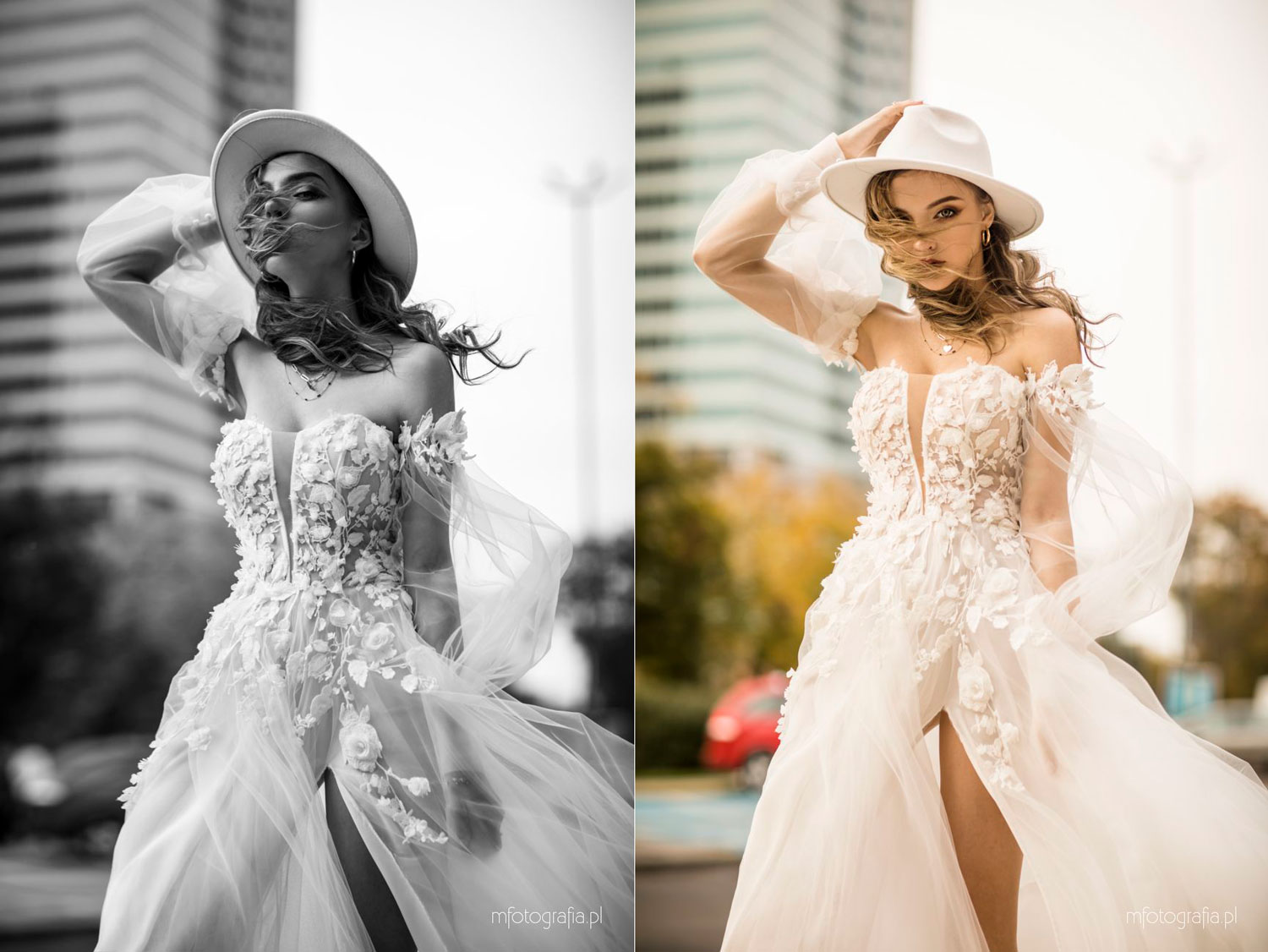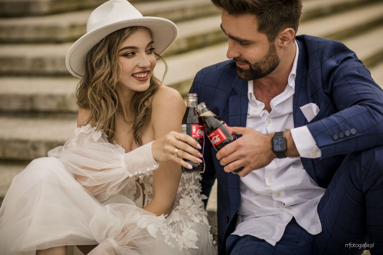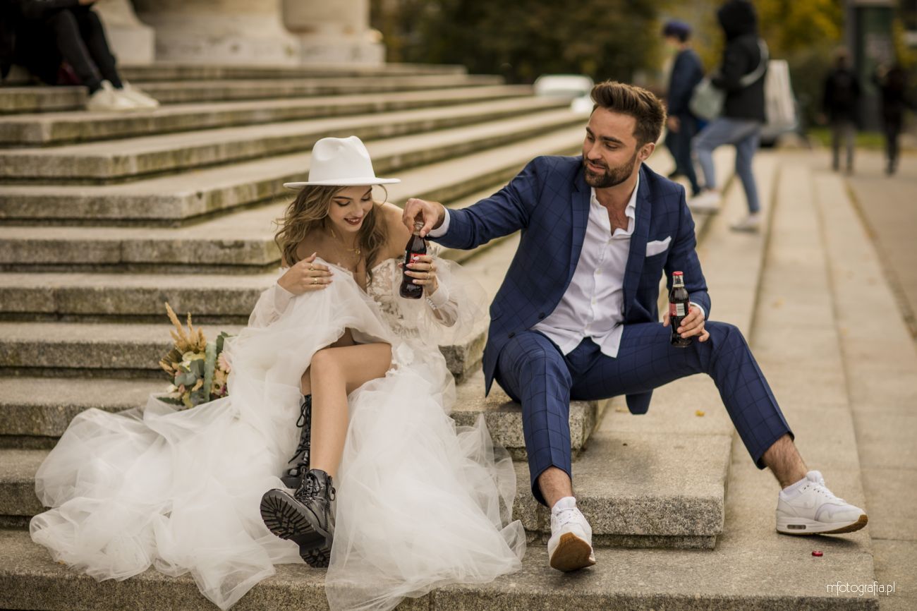 Ta część sesji za pewne nie przypadnie do gustu miłośniczką romantycznych i zwiewnych sesji ślubnych. Brak w niej natury, zielonych miejsc i miłosnych gestów. Mamy za to nowoczesne miasto, surowy klimat oraz szalonych modeli, którzy obiecali mi, że będą się świetnie bawić przed obiektywem! Uwaga, udało się! W między czasie użyliśmy do zdjęć parę uroczych piesków, którymi podzieliła się przypadkowo przechodząca miła dziewczyna. Nie zabrakło dodatkowego lokowania produktu w postaci Coca Coli. Miały być również cudowne donaty, jednak chyba ktoś je zjadł (w międzyczasie XD). Zwróćcie uwagę na kapelusze, które nadają tu mega klimatu i stylu. Gdy na to patrze, zawsze żałuję, że mi nie jest w nich do twarzy. Wiktoria wygląda cudownie w tej stylizacji, a ciężkie kowbojskie buty, wymieniliśmy na jeszcze cięższe, rockowe. Wszystko super, ale trzecia część to będzie istny sztos!