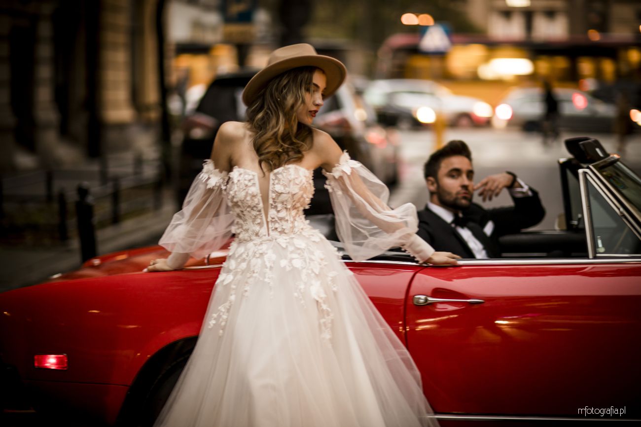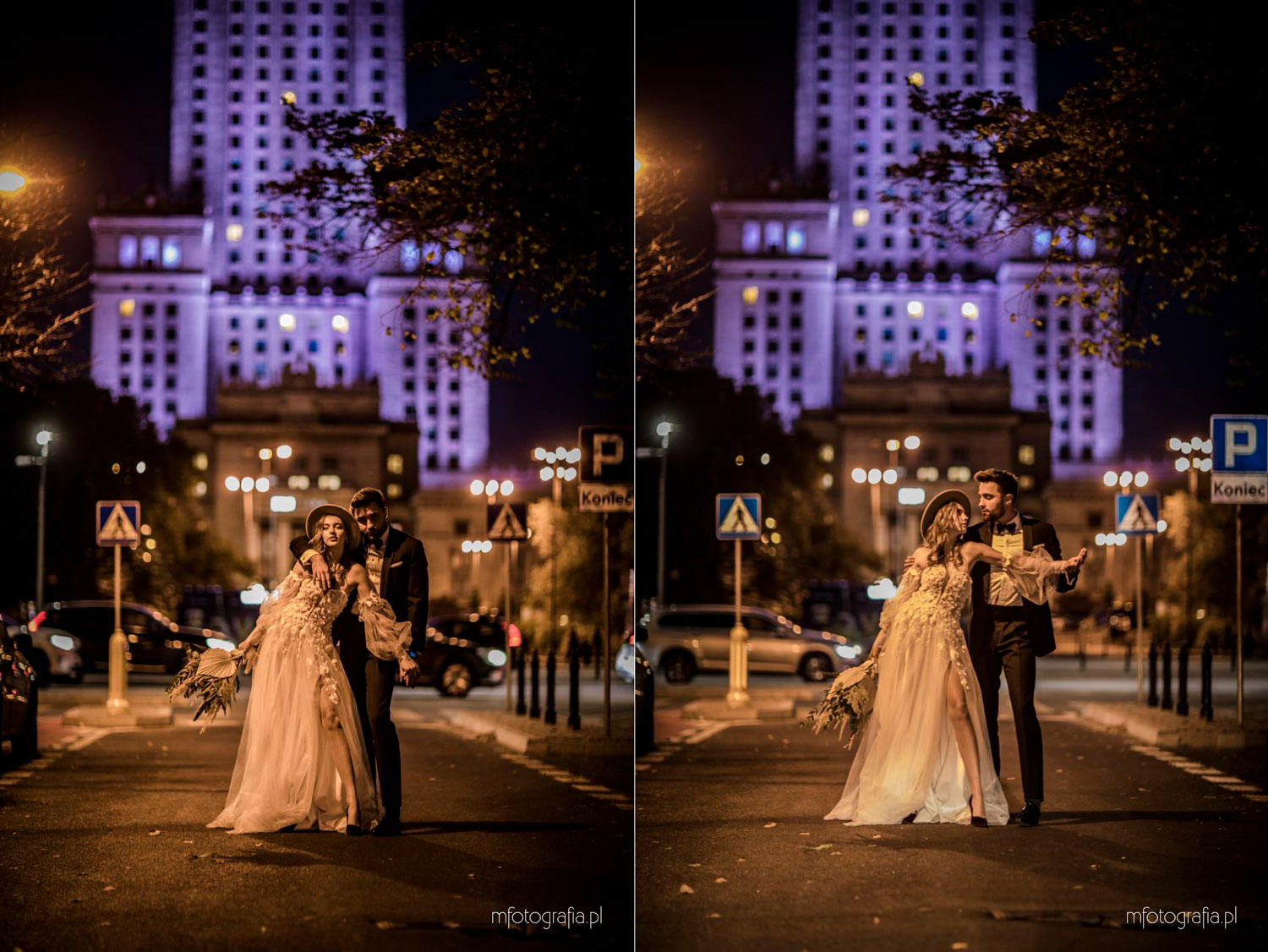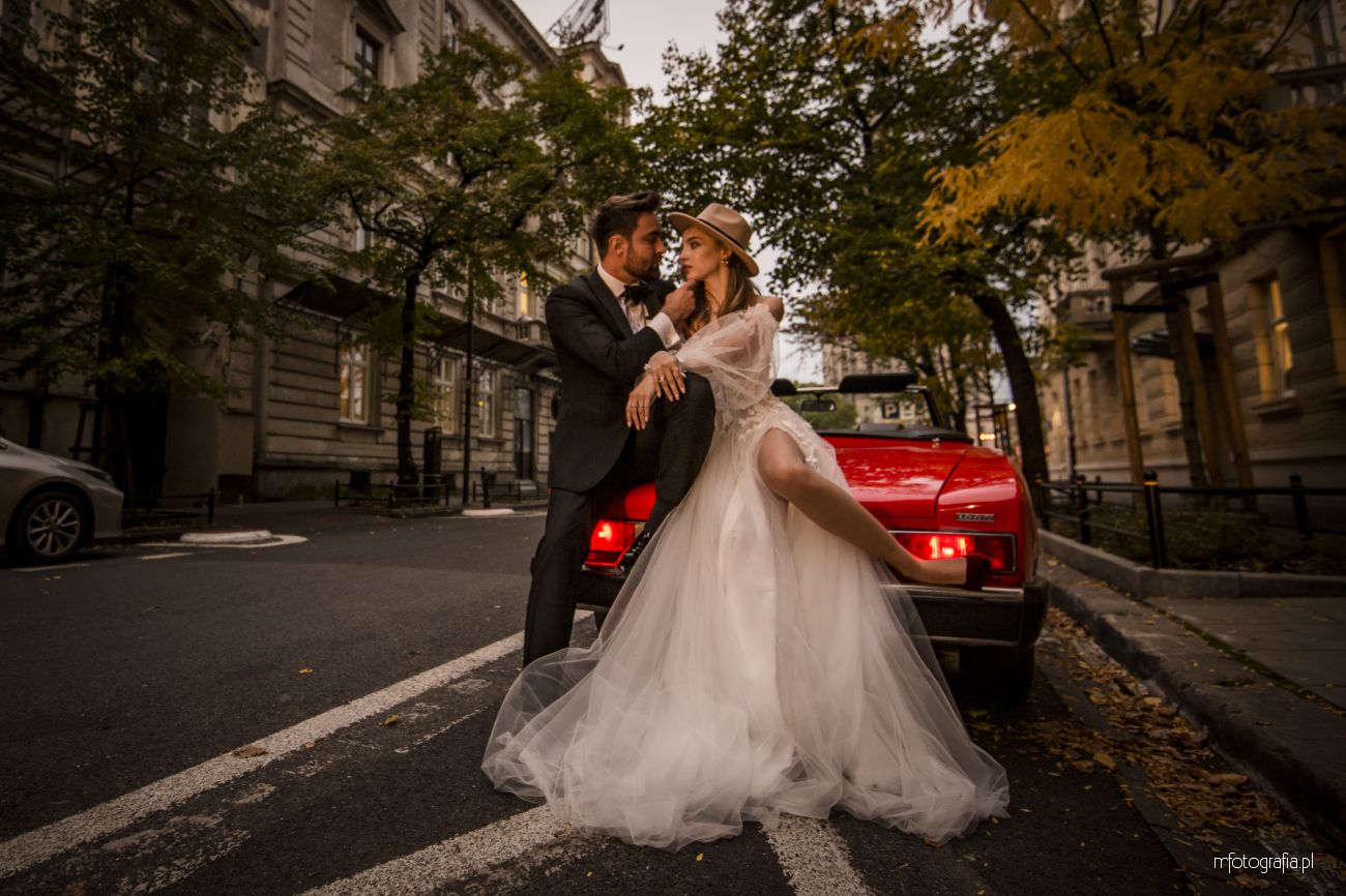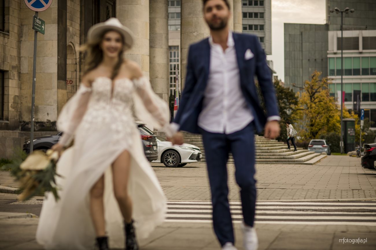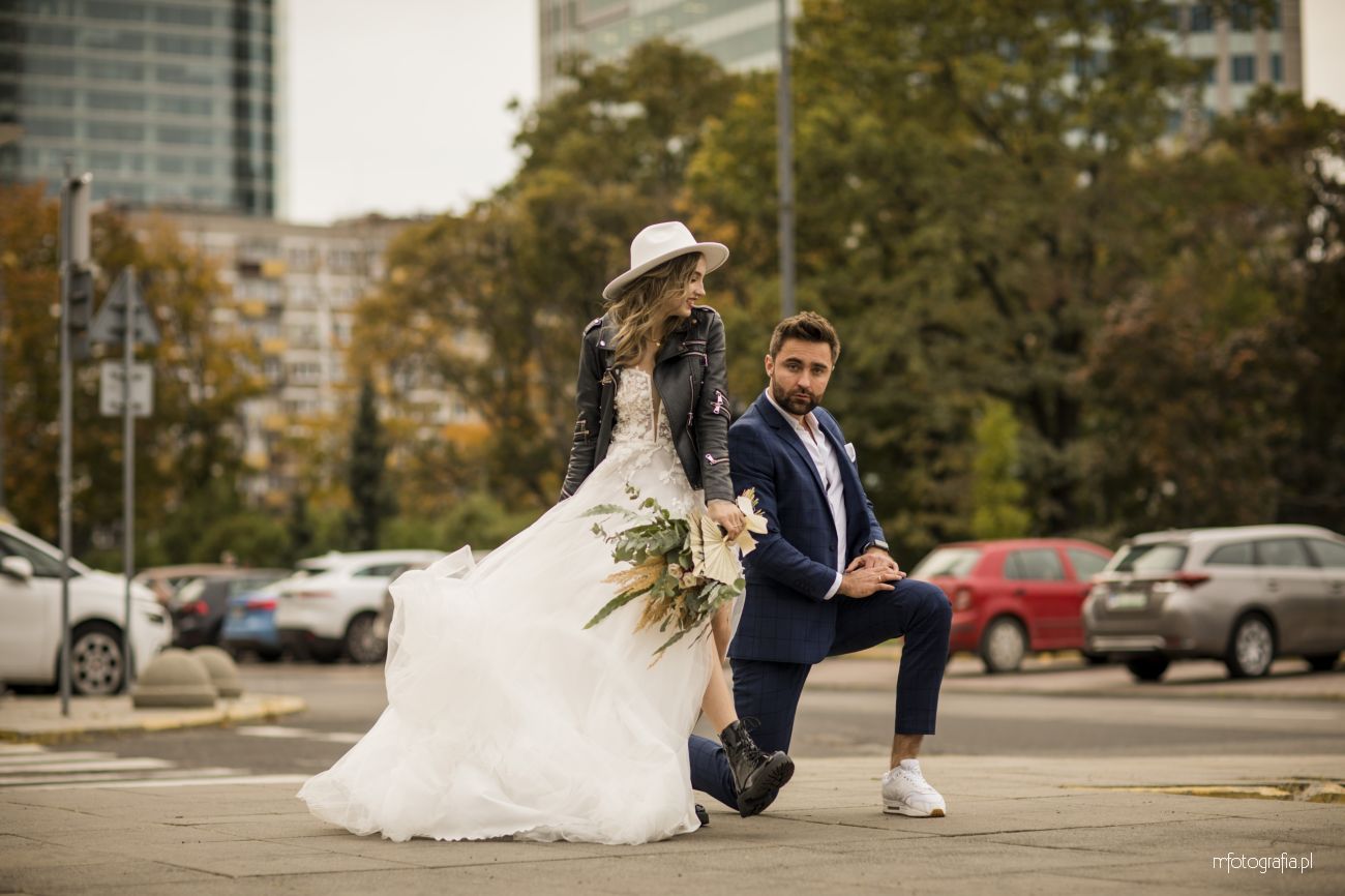Tę stylizowaną sesję ślubną zrealizowaliśmy na przepięknych ulicach Warszawy w okolicach Pałacu Kultury i Nauki (chodź jak zobaczycie, będą również inne zaskakujące miejsca). Para Młoda posiadała dwie stylizacje, które dopasowały się do wspaniałego miejskiego pleneru i surowości ulic. Pierwsza stylizacja zadziwiała. Miała charakter romantycznej sesji zdjęciowej, jednak dodatki nadały jej nowoczesnego i luźnego wyrazu. Druga z nich reprezentowała zawsze modny motyw glamour, który podkręciliśmy kilkoma szalonymi dodatkami i pięknym czerwonym autem. Efekty są niesamowite, a fakt, że robiliśmy te zdjęcia ślubne w październiku, tylko pomógł w uzyskaniu tak wspaniałych jesiennych fotografii.