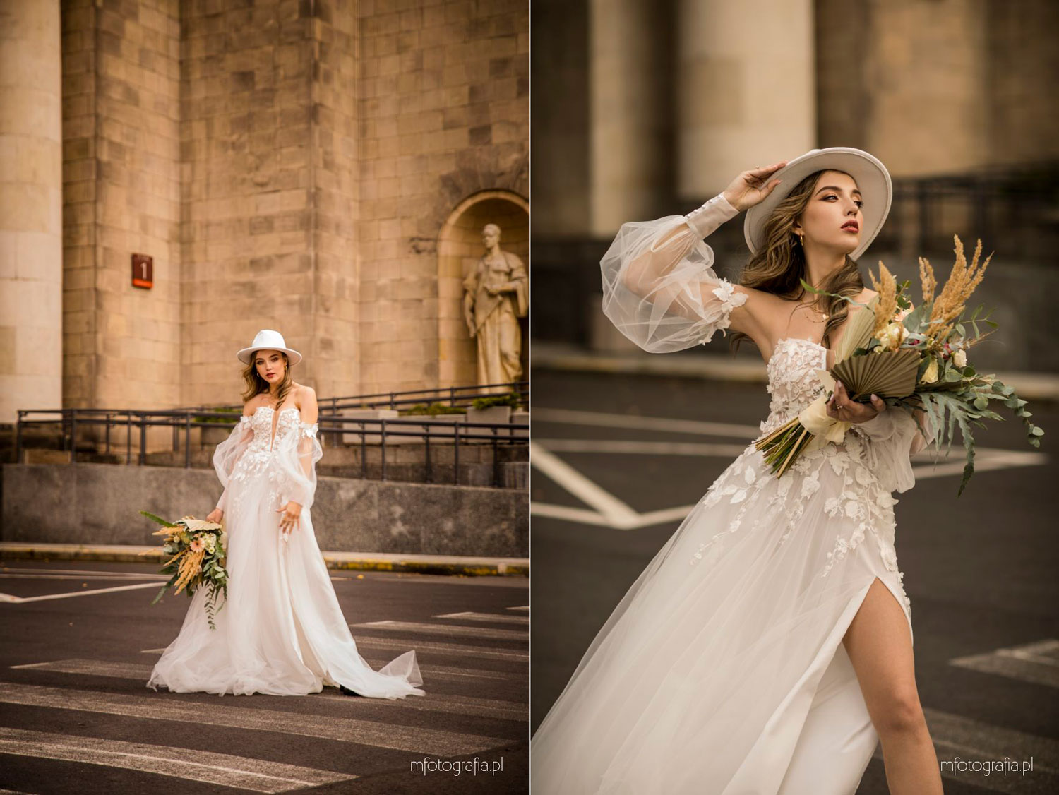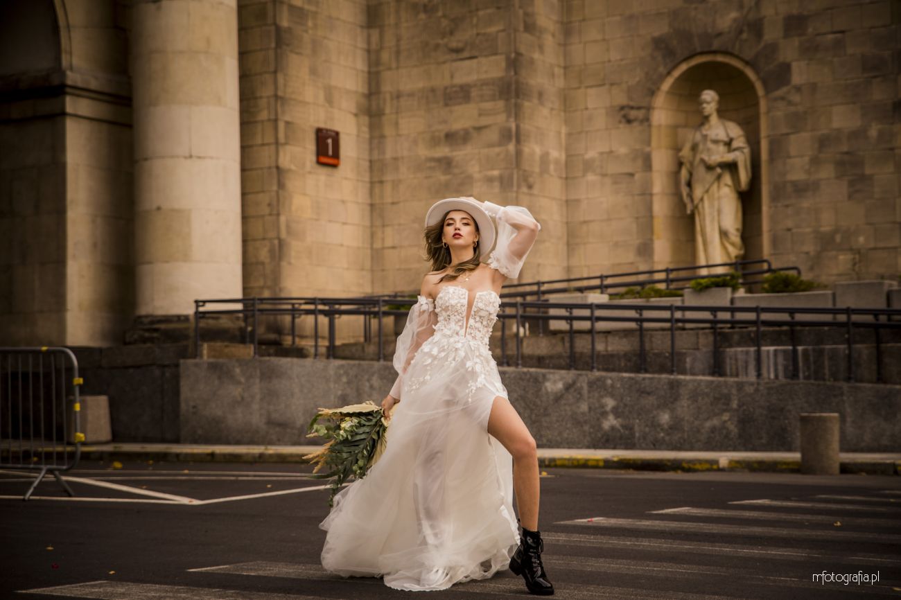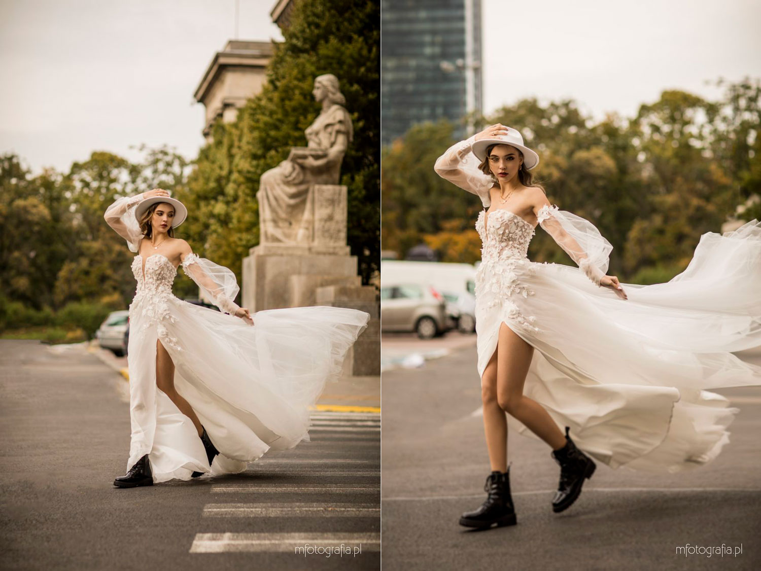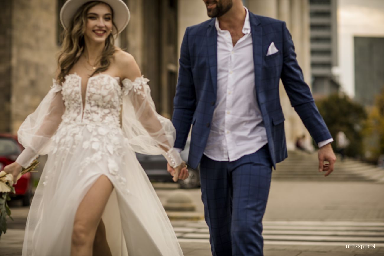 Tę stylizowaną sesję ślubną zrealizowaliśmy na przepięknych ulicach Warszawy w okolicach Pałacu Kultury i Nauki (chodź jak zobaczycie, będą również inne zaskakujące miejsca). Para Młoda posiadała dwie stylizacje, które dopasowały się do wspaniałego miejskiego pleneru i surowości ulic. Pierwsza stylizacja zadziwiała. Miała charakter romantycznej sesji zdjęciowej, jednak dodatki nadały jej nowoczesnego i luźnego wyrazu. Druga z nich reprezentowała zawsze modny motyw glamour, który podkręciliśmy kilkoma szalonymi dodatkami i pięknym czerwonym autem. Efekty są niesamowite, a fakt, że robiliśmy te zdjęcia ślubne w październiku, tylko pomógł w uzyskaniu tak wspaniałych jesiennych fotografii.