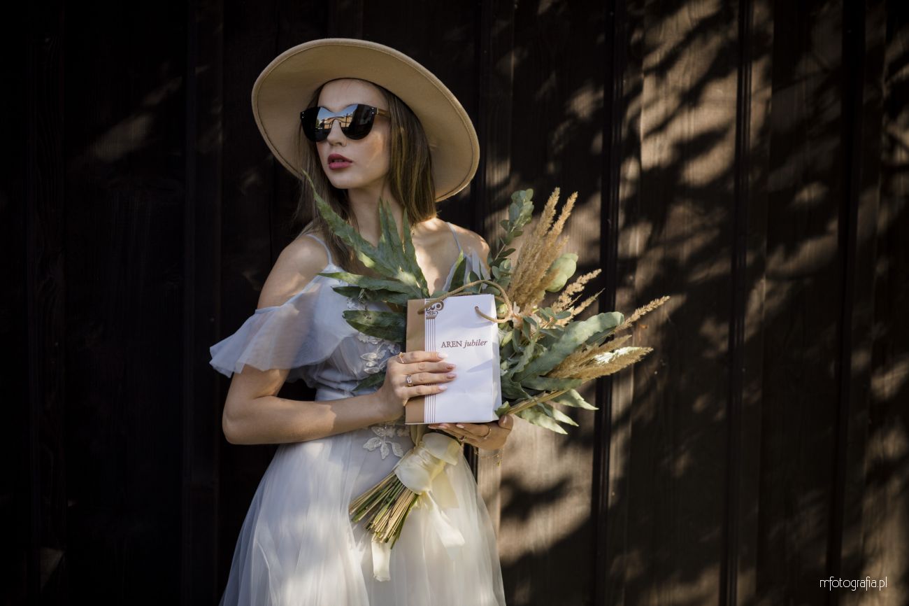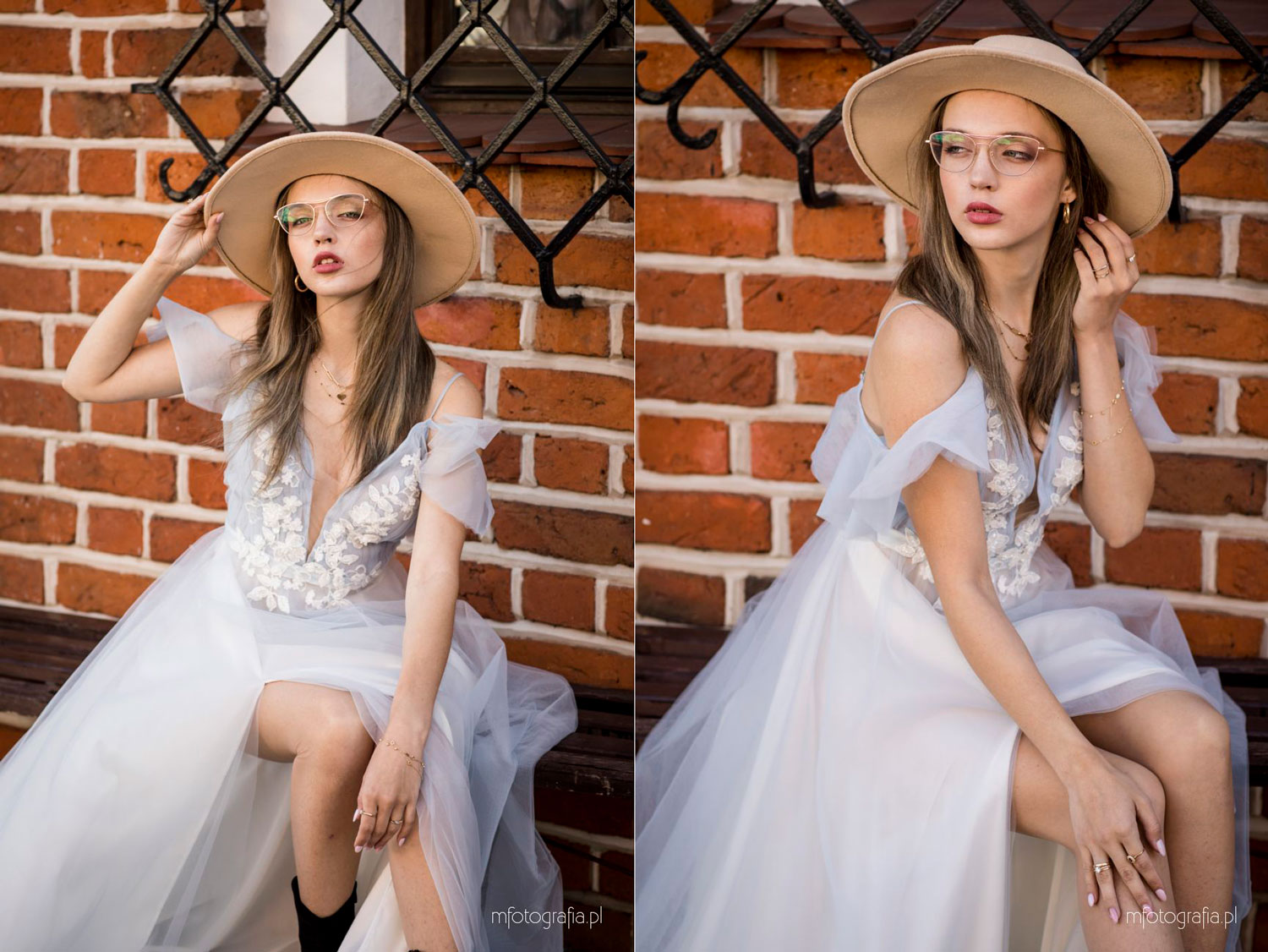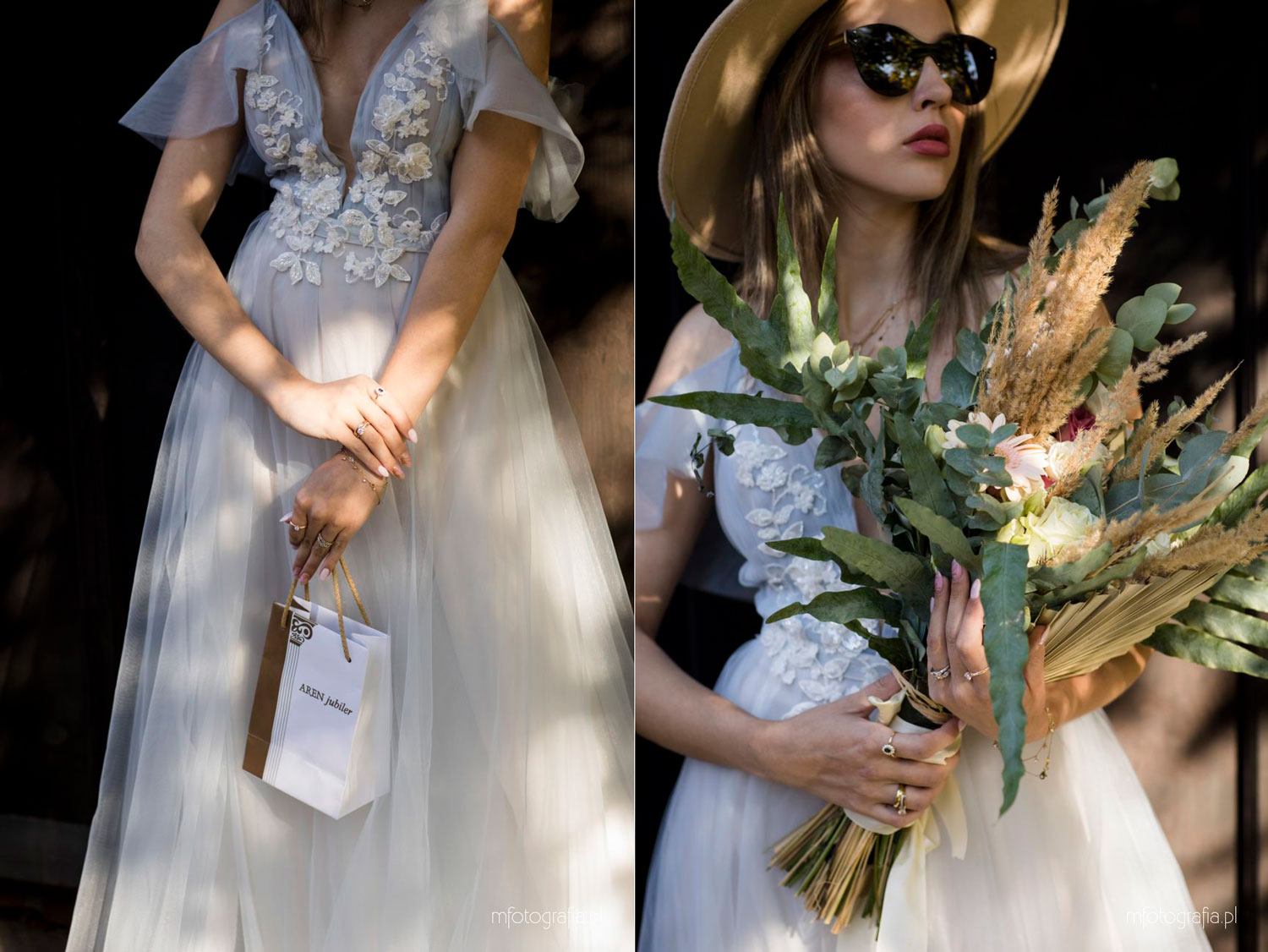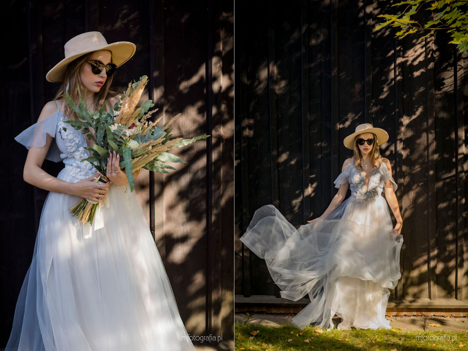 Tak jak w tytule tej części! Było nowocześnie, glamrockowo i z zajadaniem pizzy. Ale po kolei i do rzeczy. Sesję stylizowaną rozpoczęliśmy na rynku w Piasecznie, wczesnym przedpołudniem. W zasadzie nie praktykuję robienia zdjęć o takiej porze, ale mieliśmy do ogarnięcia trzy lokalizacje i trzy stylizacje. Trzeba było zacząć wcześniej. Na rozgrzewkę pospacerowaliśmy, zrobiliśmy pojedyncze portrety i zjedliśmy pizze, bo był czas obiadu 😉 Takie kadry miejskie chodziły za mną od dawna! Potrzebuję w swoim portfolio coś świeżego i wychodzącego poza utarte schematy. Zdecydowałam się więc na wybór romantycznej i zwiewnej błękitnej sukni (suknie ślubne Magdalena Popiel), której charakter przełamaliśmy cięższymi dodatkami w postaci kapelusza, okularów i kowbojek (czarnych!!!). Wiktoria wyglądała stylowo, ale bardzo naturalnie. Środek dnia to nie czas na ciężkie makijaże. Martin postawił na granatowy garnitur w lekką kratę i sportowe białe buty. Dla zupełnego zakręcenia schematami, dołożyliśmy bukiet w charakterze bohostyle. Mieszanka wybuchowa, ale sami oceńcie jak wyszło fajnie: