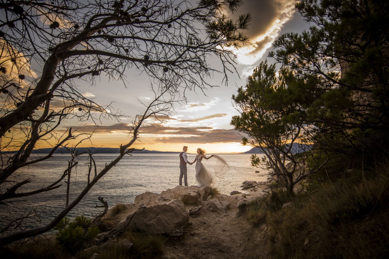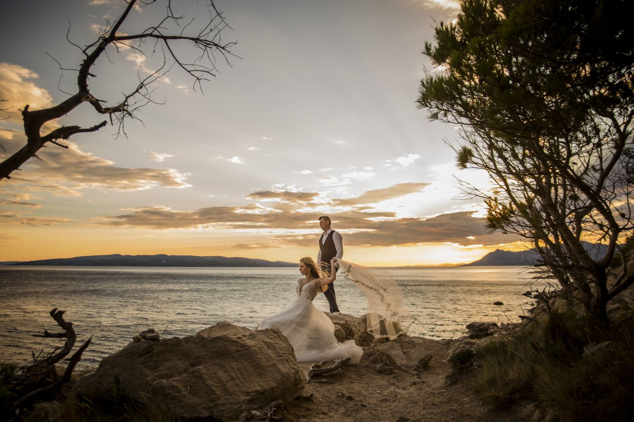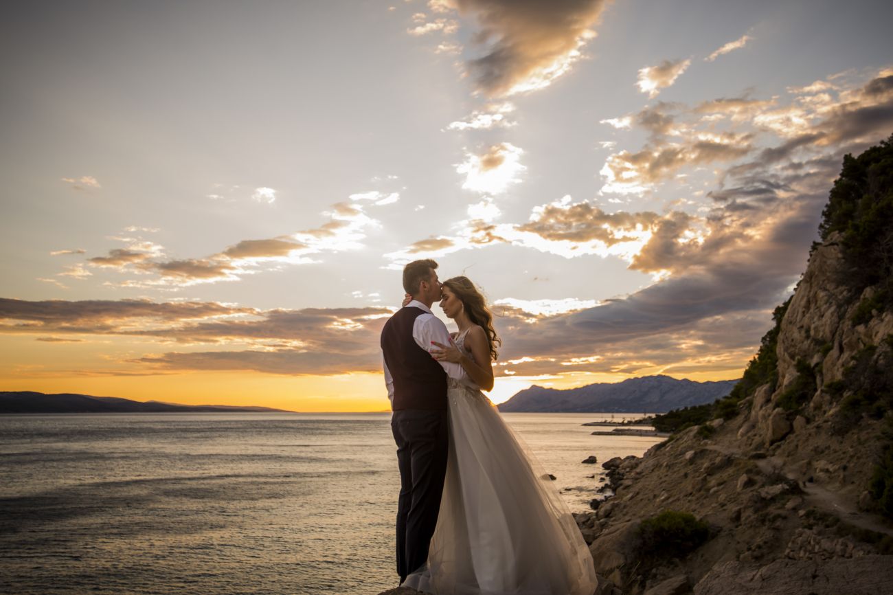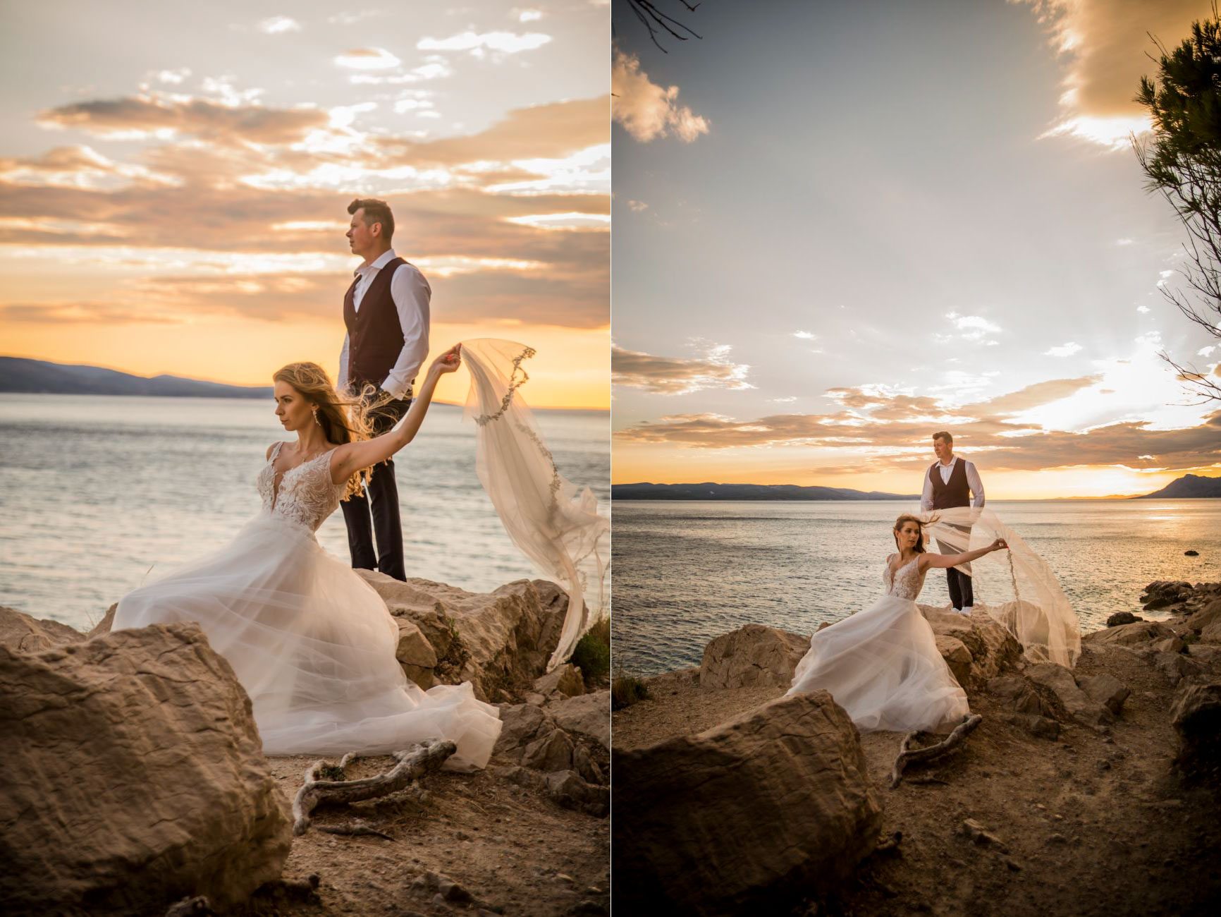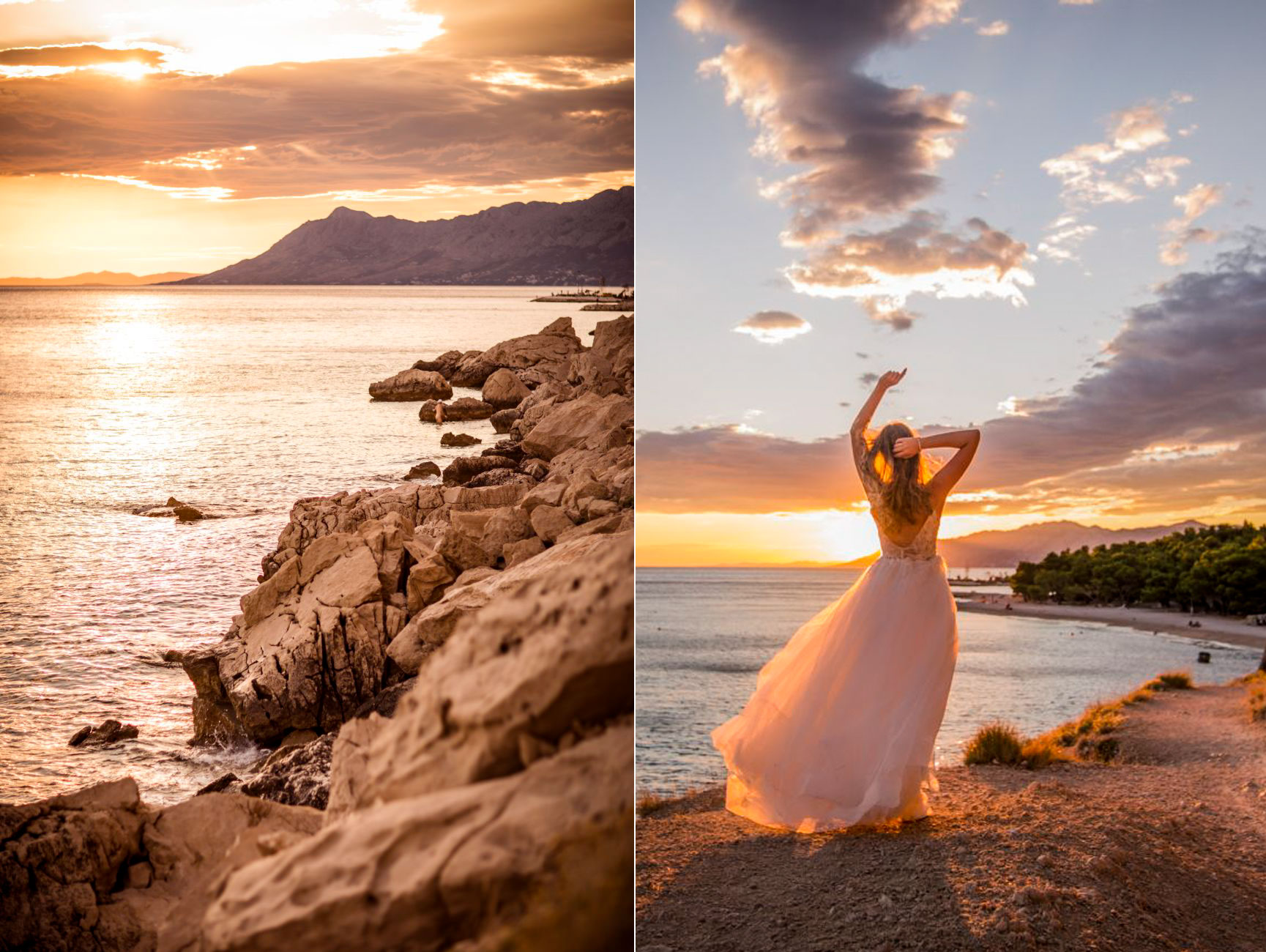 Ślubne sesje zagraniczne zazwyczaj rozkładamy na kilka części i miejsc. Pierwsza część sesji odbyła się pierwszego dnia o zachodzie słońca. Wybraliśmy wspaniałe miejsce, w otoczeniu morza i skalistych wybrzeży Makarskiej Riwiery w Chorwacji. Oto efekty: