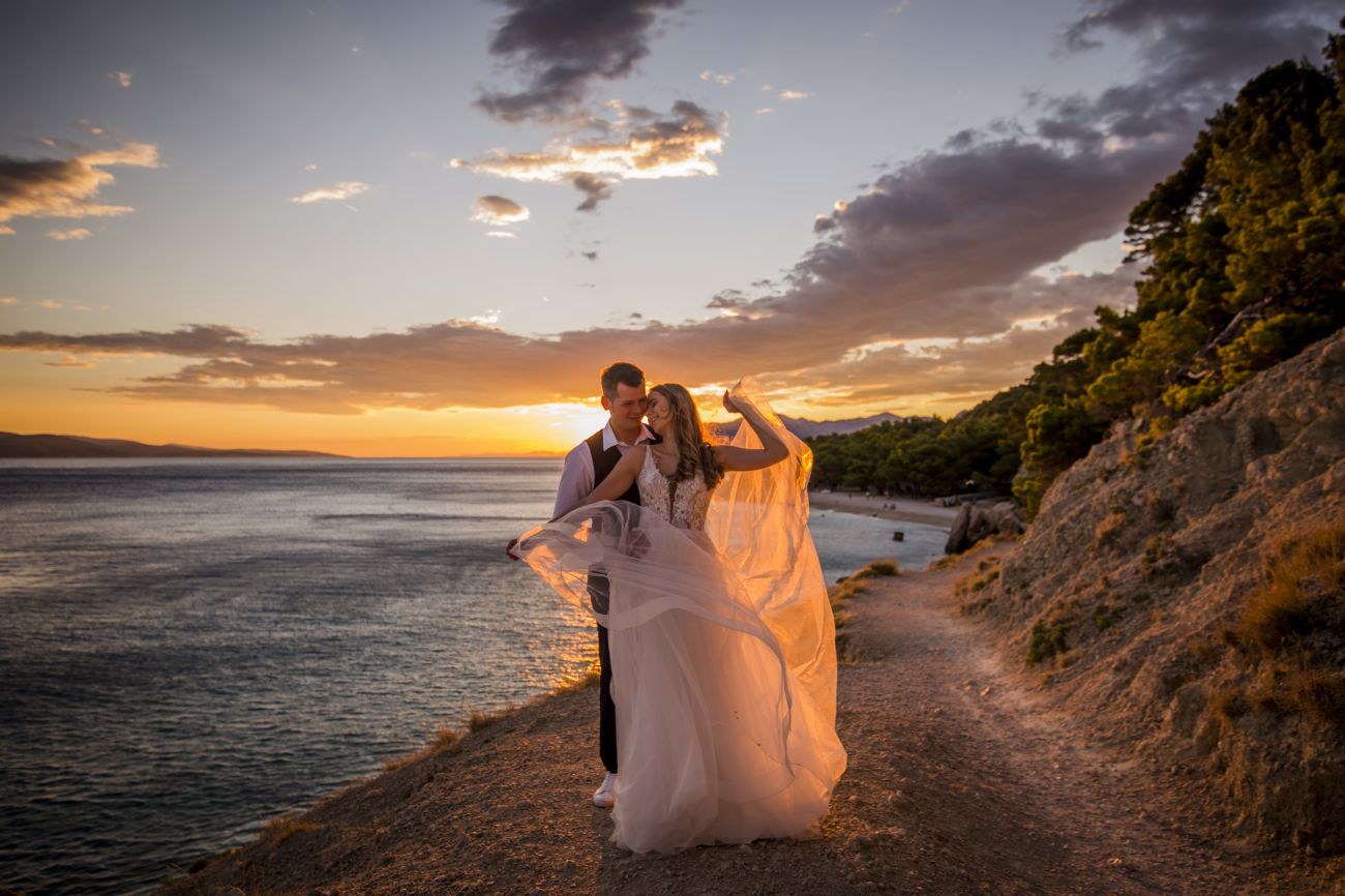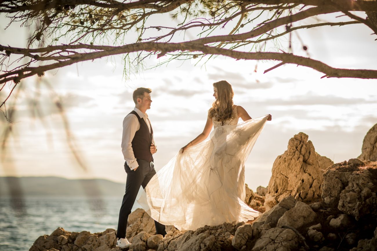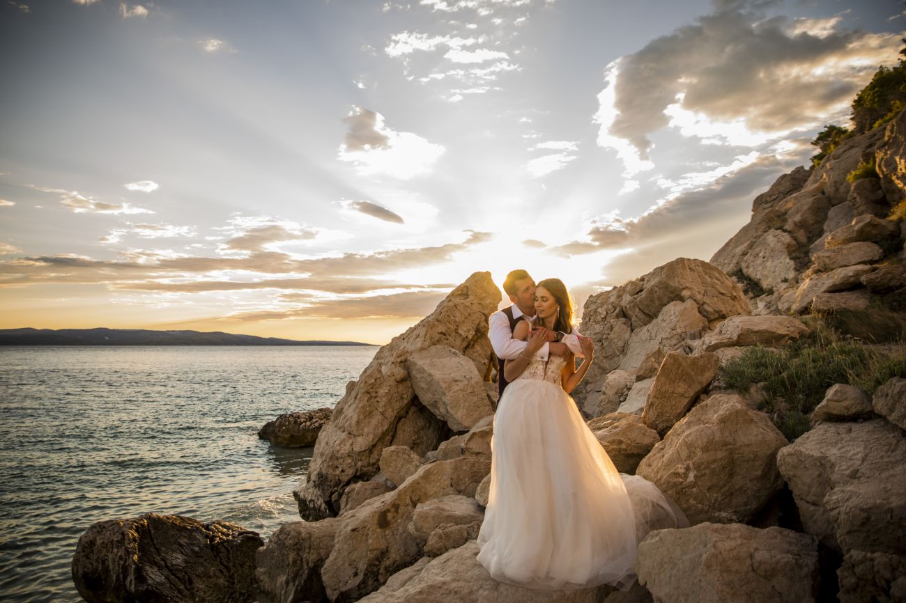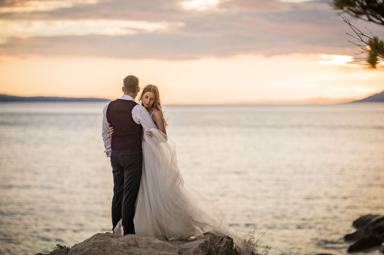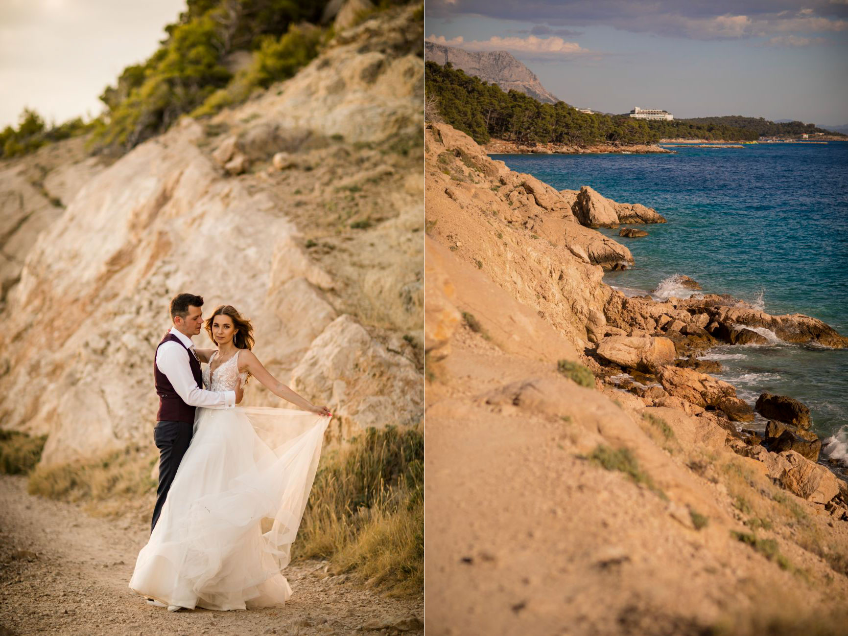 Ślubne sesje zagraniczne zazwyczaj rozkładamy na kilka części i miejsc. Pierwsza część sesji odbyła się pierwszego dnia o zachodzie słońca. Wybraliśmy wspaniałe miejsce, w otoczeniu morza i skalistych wybrzeży Makarskiej Riwiery w Chorwacji. Oto efekty: