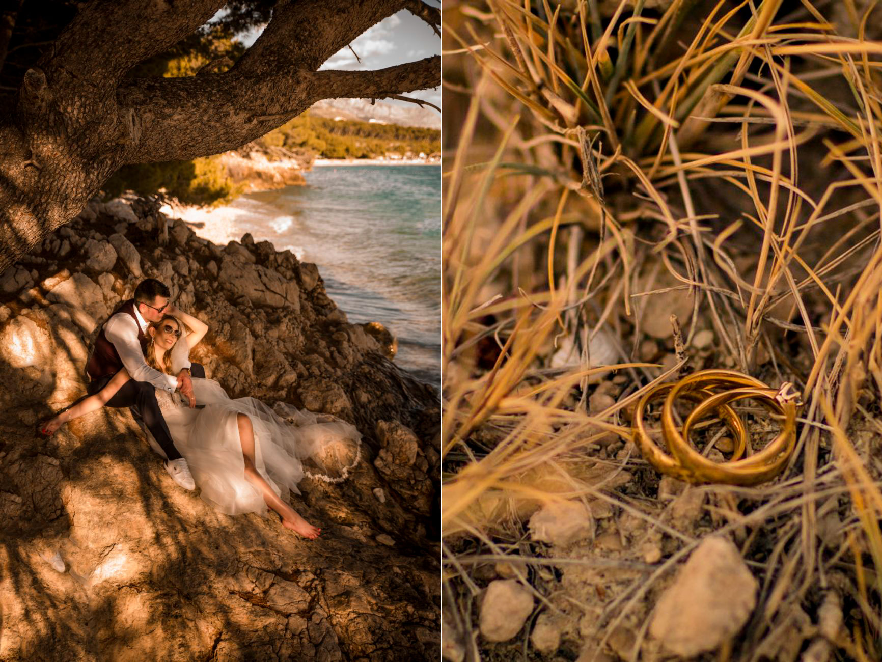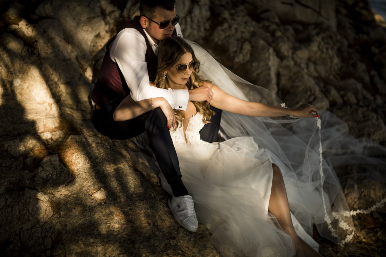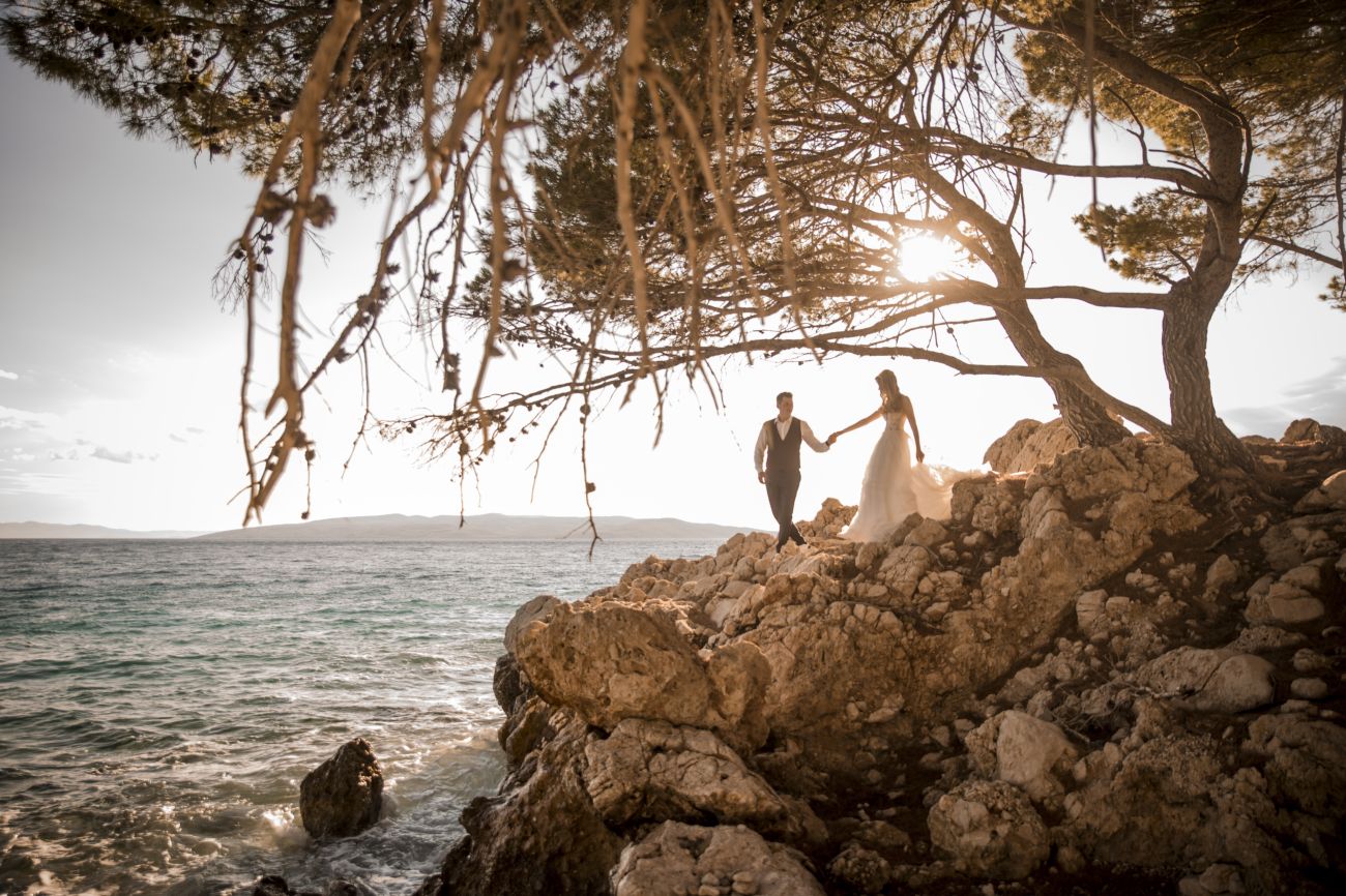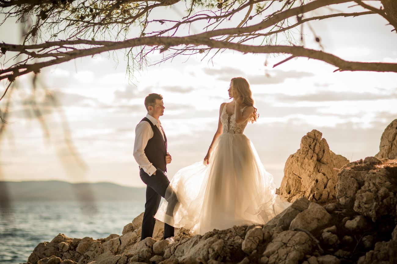 Ślubne sesje zagraniczne zazwyczaj rozkładamy na kilka części i miejsc. Pierwsza część sesji odbyła się pierwszego dnia o zachodzie słońca. Wybraliśmy wspaniałe miejsce, w otoczeniu morza i skalistych wybrzeży Makarskiej Riwiery w Chorwacji. Oto efekty: