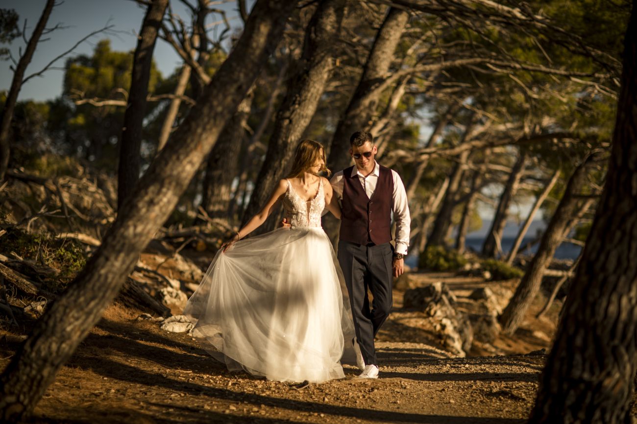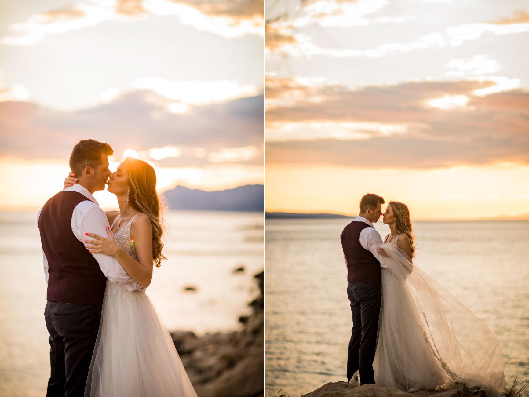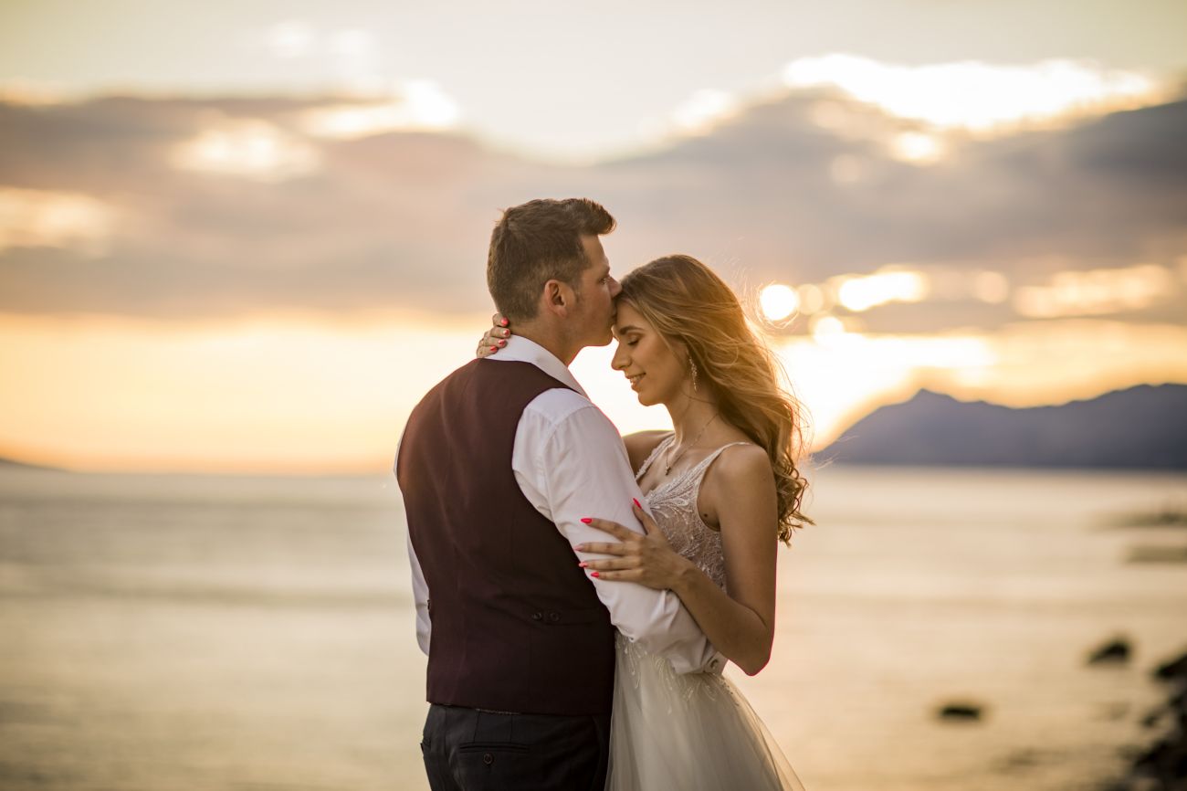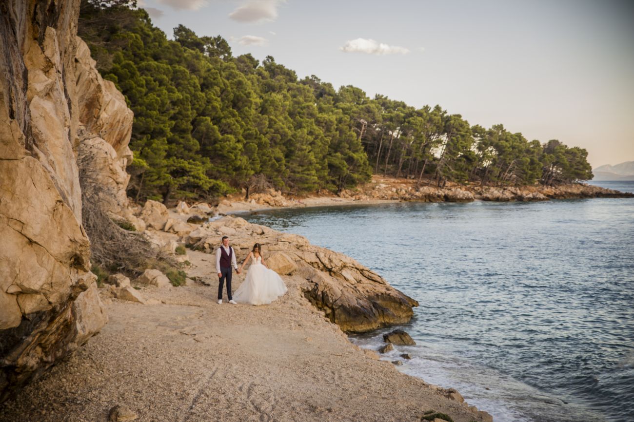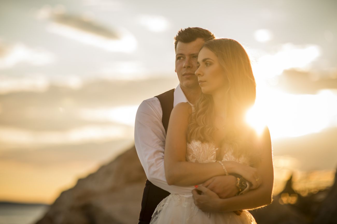 Ślubne sesje zagraniczne zazwyczaj rozkładamy na kilka części i miejsc. Pierwsza część sesji odbyła się pierwszego dnia o zachodzie słońca. Wybraliśmy wspaniałe miejsce, w otoczeniu morza i skalistych wybrzeży Makarskiej Riwiery w Chorwacji. Oto efekty: